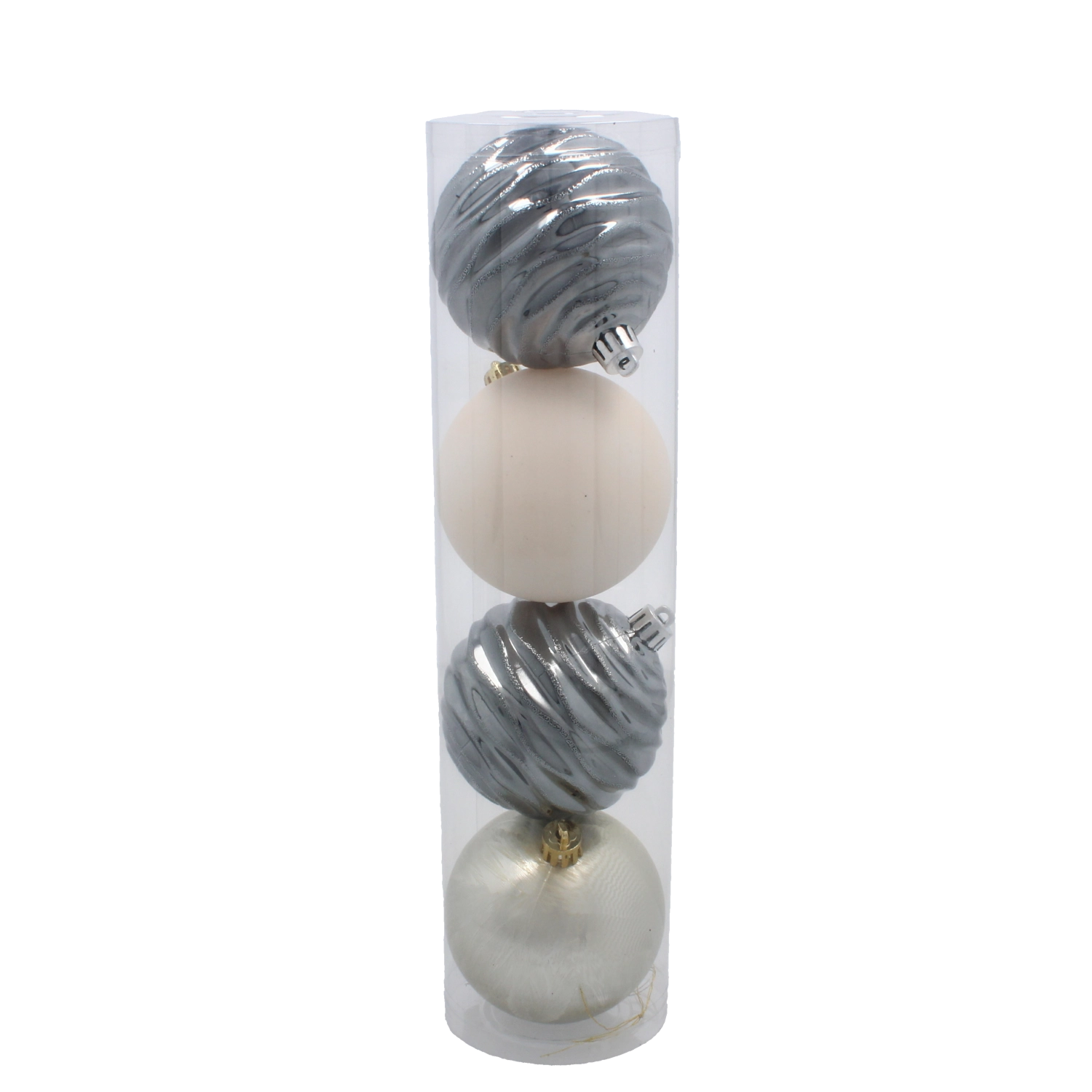 Eleganten set štirih božičnih krogel s premerom 8 cm v odtenkih šampanjske, sive in bele doda okrasitvi sofisticiran videz in harmonijo. Odporna plastika zagotavlja varno ravnanje in dolgo življenjsko dobo, mešanica mat, sijajnih in bleščečih površin pa ustvari izrazit kontrast. Praktična prosojna tuba služi za shranjevanje, razstavljanje in enostavno obdarovanje.