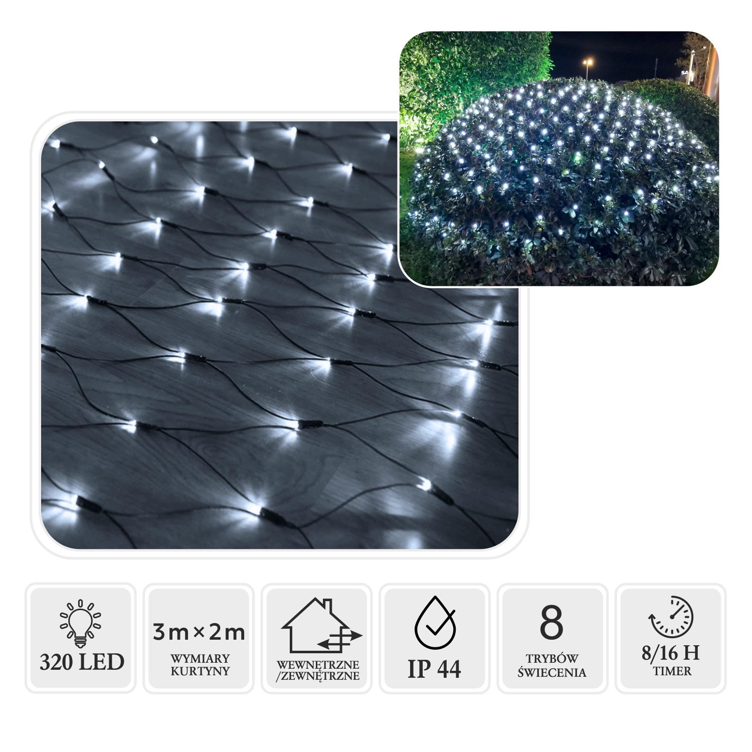Razsvetlite svoj dom in vrt s stilno osvetlitvijo. Ta svetlobna mrežna zavesa s 320 LED v hladno belem odtenku ponuja 8 načinov delovanja, pomnilnik zadnje nastavitve in časovnik 8/16 h. Zahvaljujoč zaščiti IP44 je idealna za zunanjo in notranjo uporabo, z merami 3 × 2 m pa zanesljivo pokrije veliko površino.