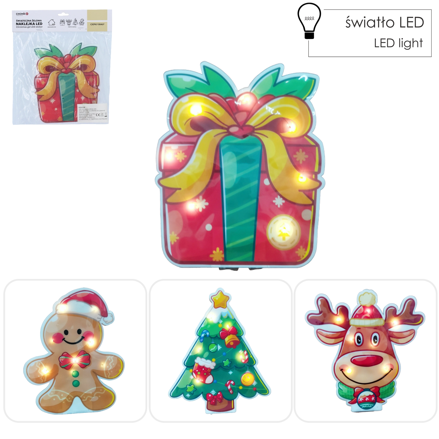 V svoj dom vnesite čar Božiča z dekorativno gel nalepko z LED. Izberite motiv smrečice, darila, jelena ali medenjakovega možica in ustvarite prijetno vzdušje s toplim belim svetlobnim sijem. Nalepka se zlahka pritrdi na steklo, ogledalo ali pohištvo, deluje na baterijo in ne potrebuje kablov. Hitra okrasitev za okna in otroško sobo.