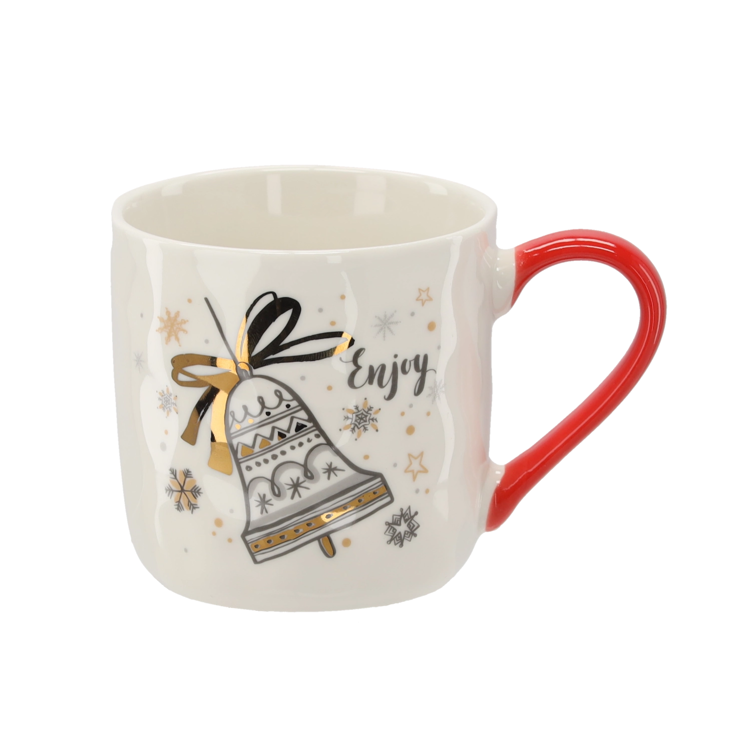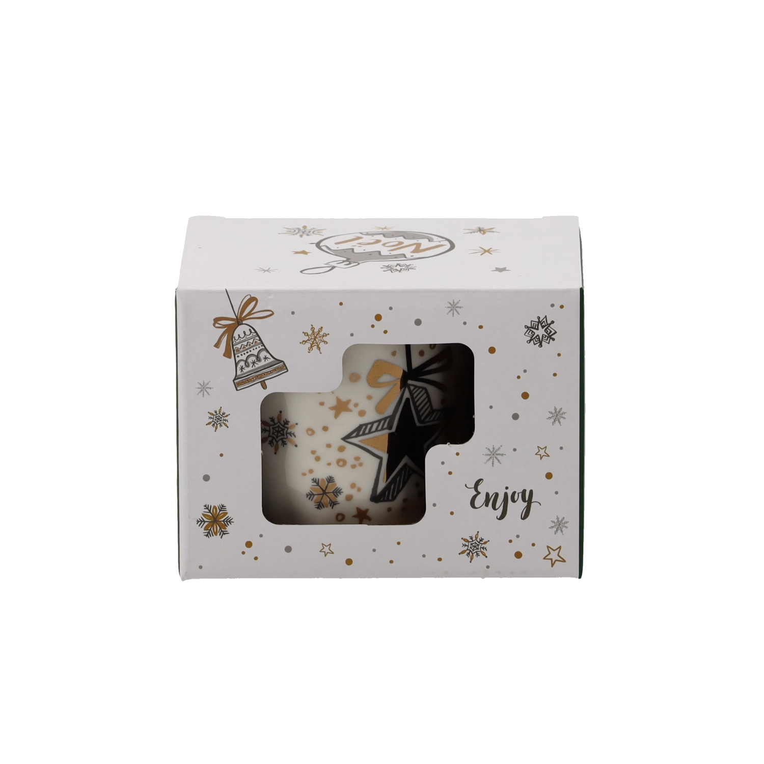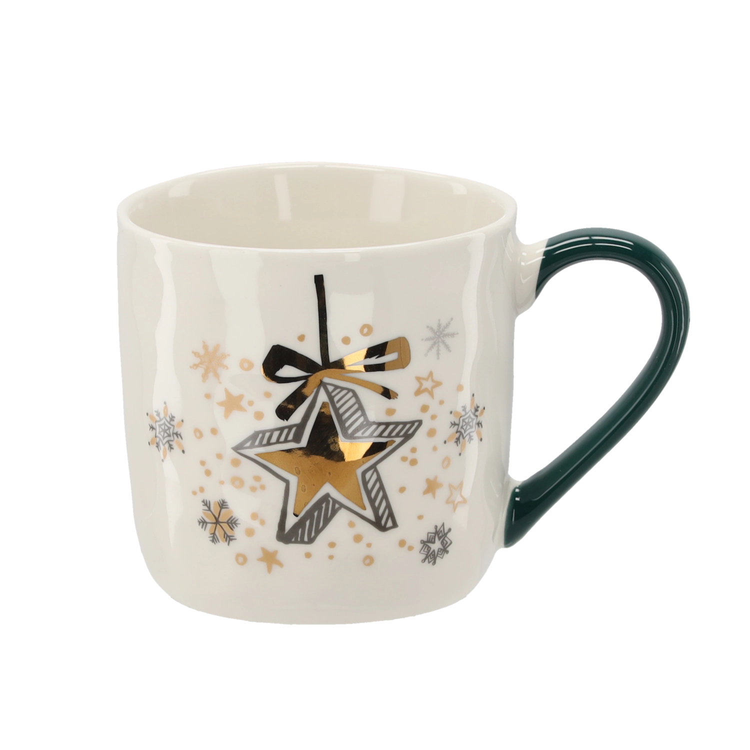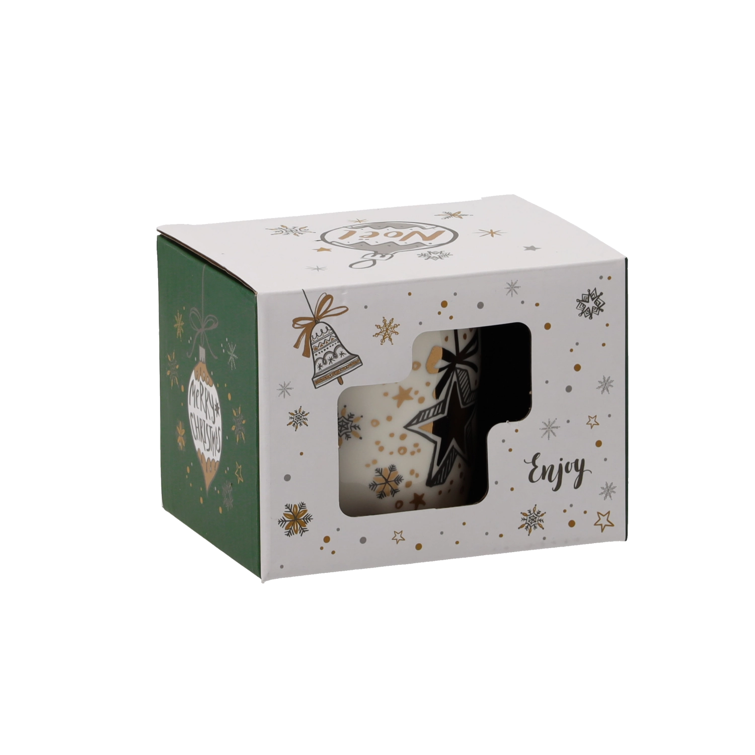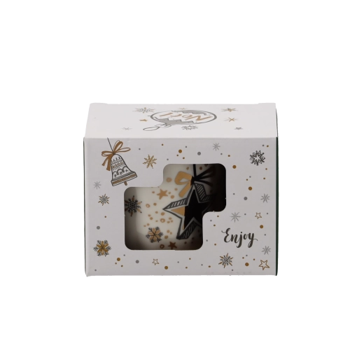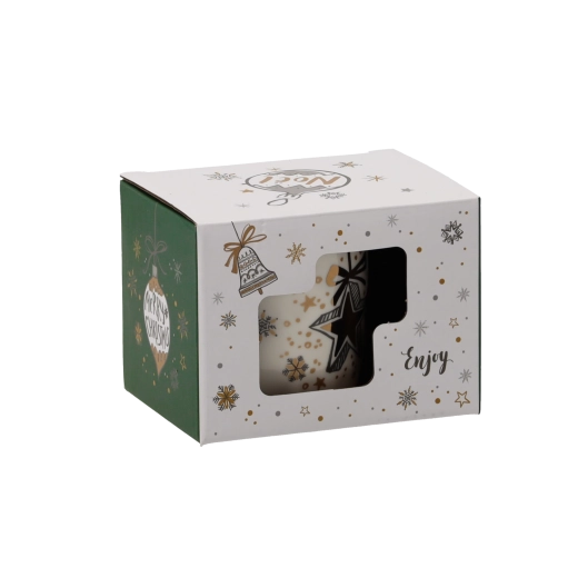 Privoščite si veselje ali razveselite svoje bližnje s porcelanasto skodelico z nežnim kremnim pridihom in prazničnimi detajli v zlati, zeleni in beli barvi. Edinstveni motivi zvezdic, zvončkov in bunk poudarijo božično vzdušje in spremenijo vsak vroč napitek v prijeten ritual.