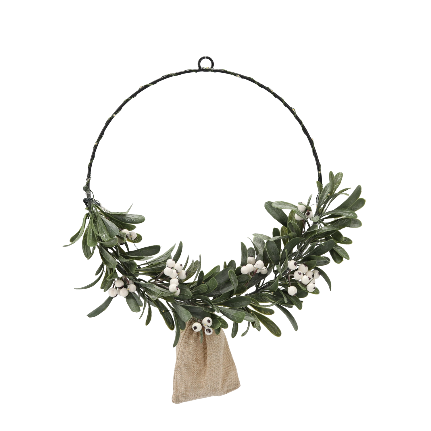 Očarajte obiskovalce z diskretno praznično okrasitvijo. Ta dekorativni venec združuje črn kovinski obroč z realističnimi iglicami in imelom, dopolnjenimi z nežnimi belimi jagodami. Vgrajena LED osvetlitev s toplim pridihom ustvari prijetno, pomirjujočo svetlobo, idealno za zimske večere.