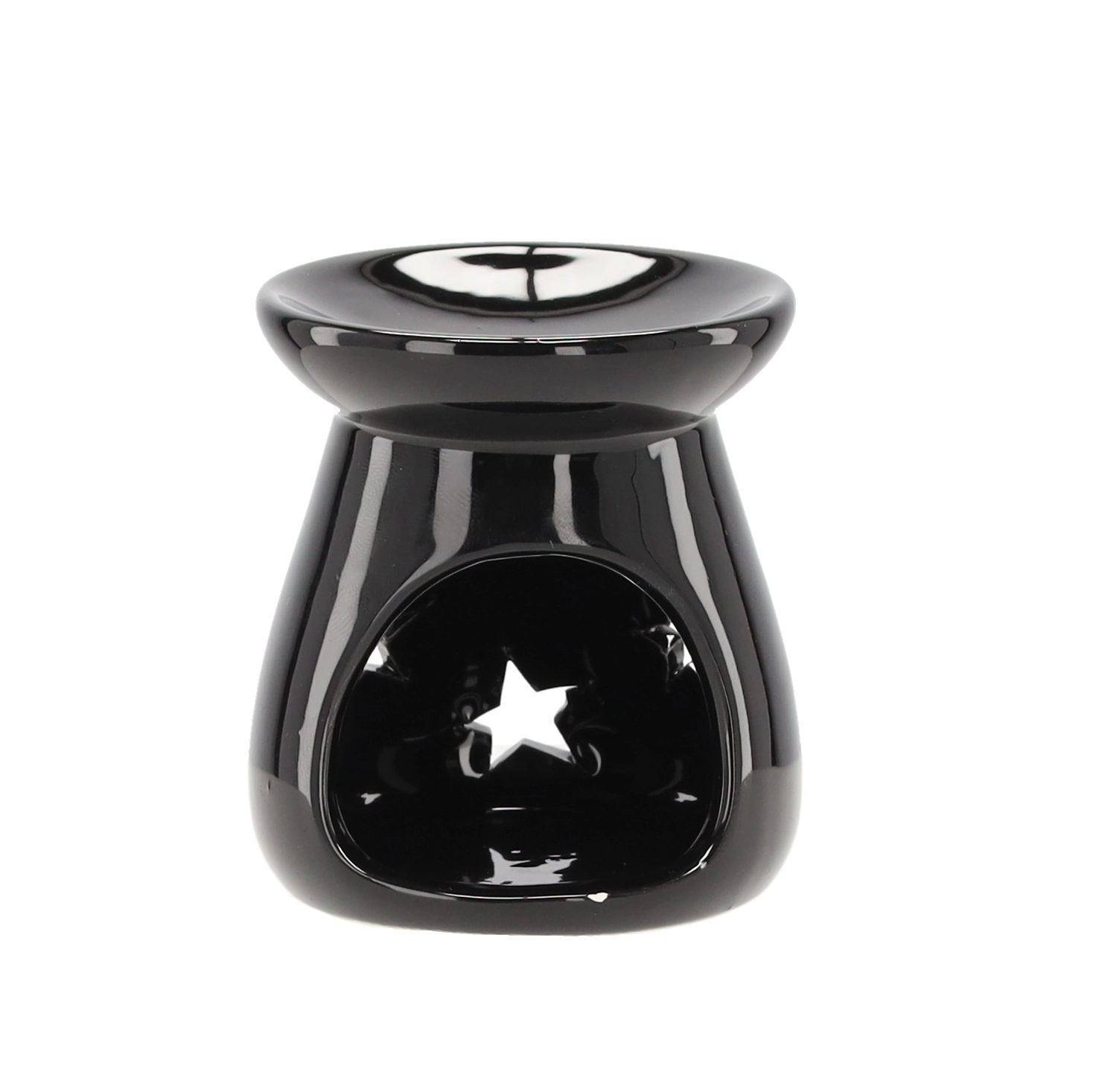 Stilska aromatična svetilka iz glazirane keramike prinaša nežne svetlobne učinke zahvaljujoč izrezom v obliki zvezd. Zgornja posodica je namenjena za dišeči vosek ali eterična olja, spodnja odprtina pa sprejme klasično čajno svečko. Kompaktne mere 7 × 8 cm omogočajo postavitev na polico, klubsko mizico ali okensko polico.