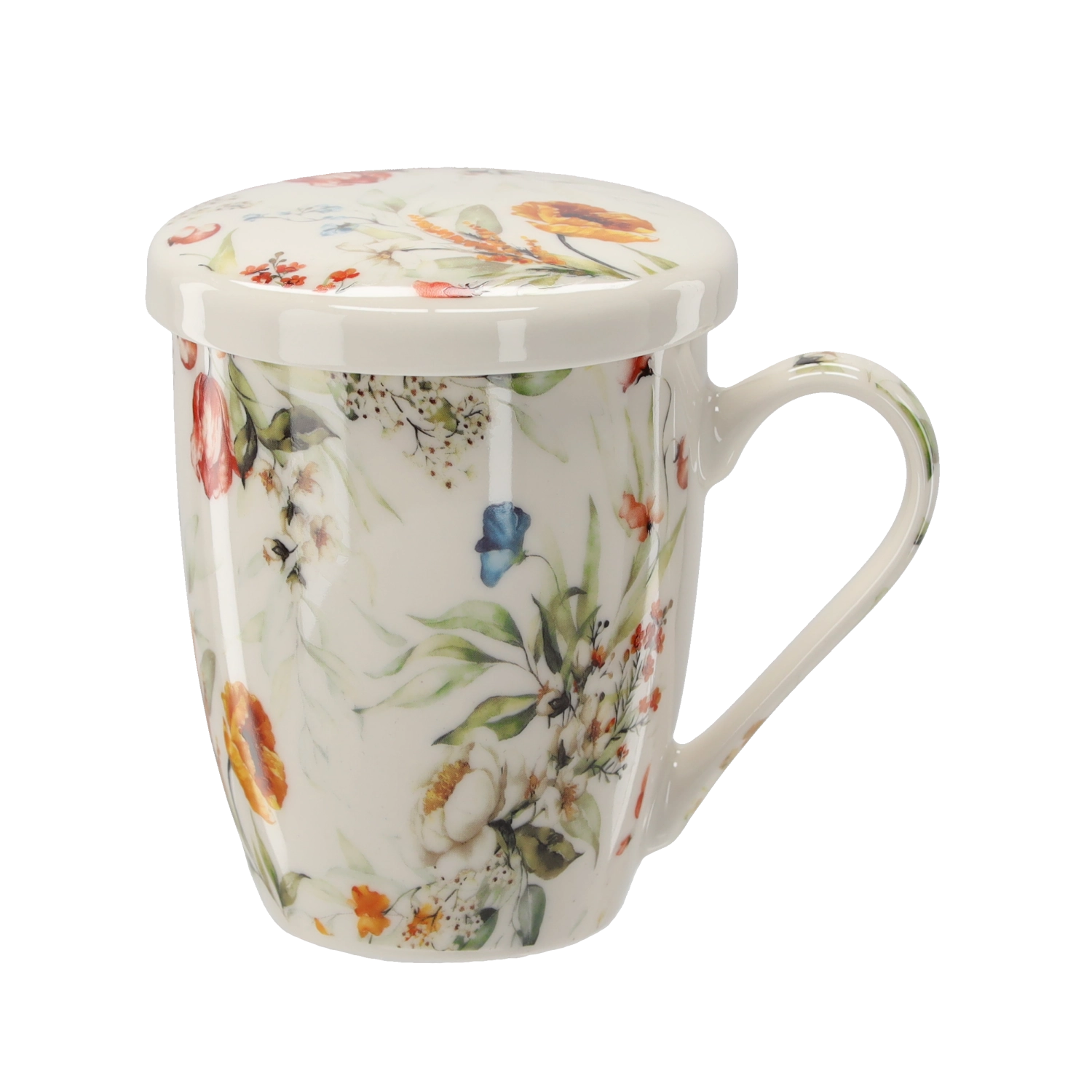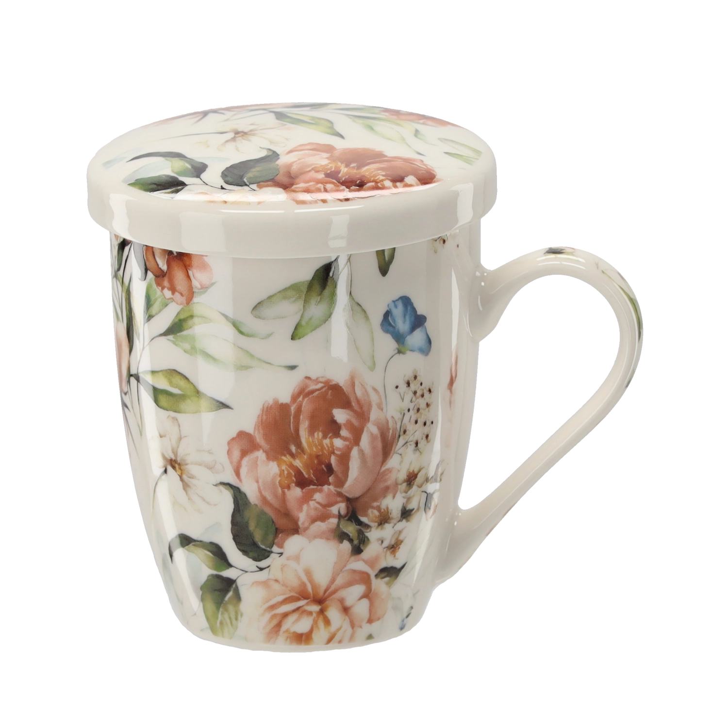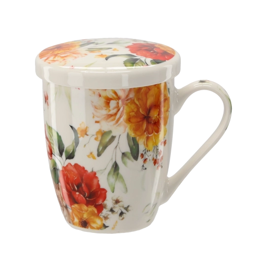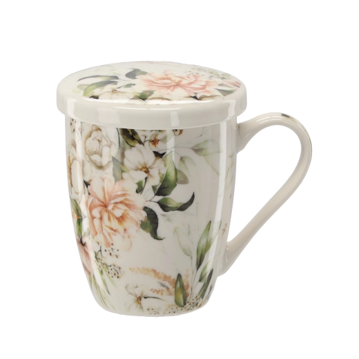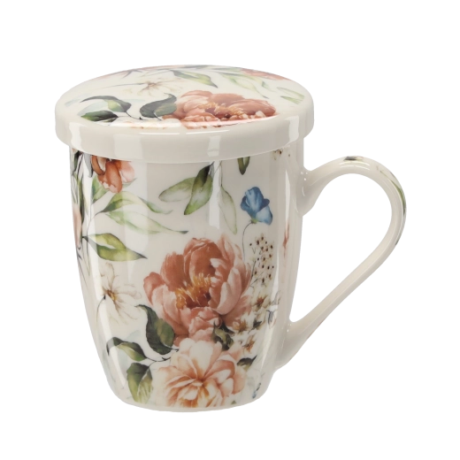 Elegantna porcelanasta skodelica s prostornino 340 ml z odstranljivim nerjavnim cedilom in pokrovom za udobno pripravo čaja in zeliščnih napitkov. Pokrov ohrani pijačo dlje toplo in služi kot praktična podloga za cedilo po namakanju. Kakovosten porcelan, ergonomski ročaj in cvetlični dizajn za stilsko uživanje vročih napitkov. Primerno za mikrovalovko in pomivalni stroj (brez cedila).