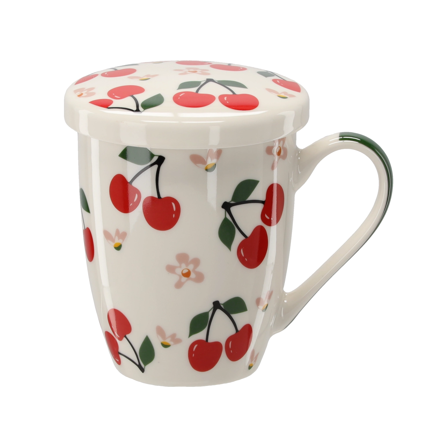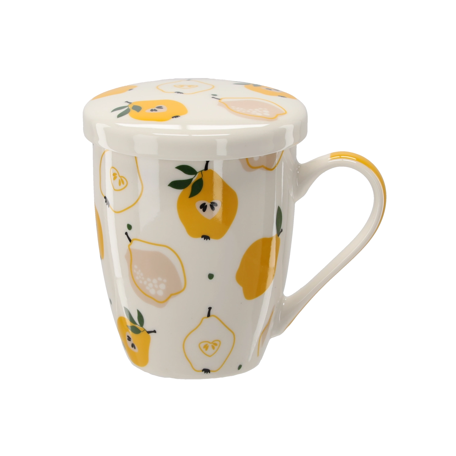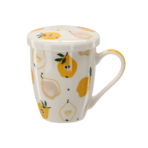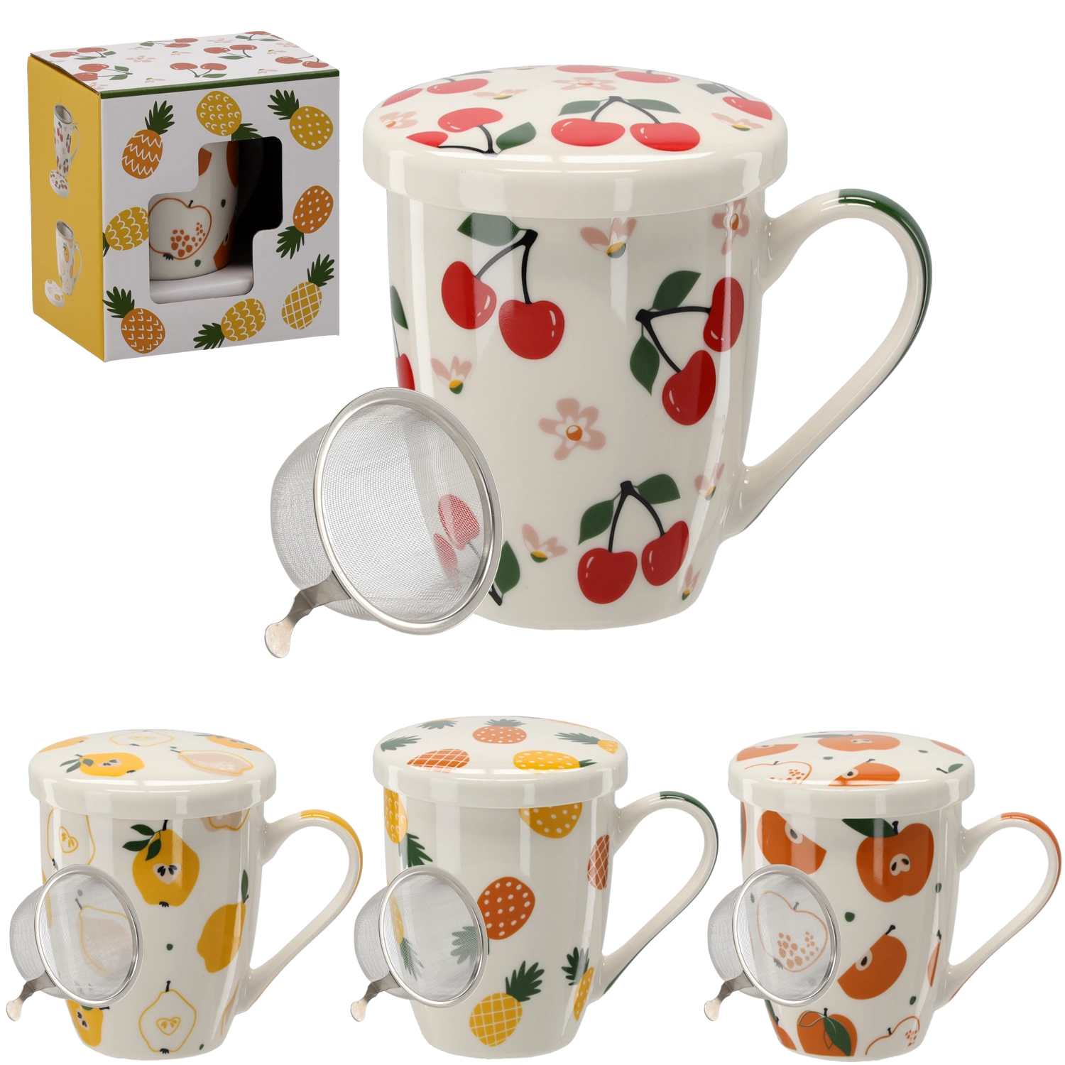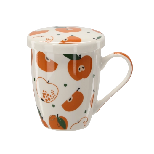 Stilska porcelanasta skodelica s prostornino 340 ml z vgrajenim sitkom in pokrovom je idealna za vsakodnevno pitje čaja in zeliščnih napitkov. Zahvaljujoč finemu sitku pripravite rahlolisti čaj brez nečistoč, medtem ko pokrov dlje ohranja toploto pijače. Kakovosten porcelan, ergonomsko uho in sveži sadni motivi jo delajo praktičen in čudovit dodatek vaši kuhinji.
