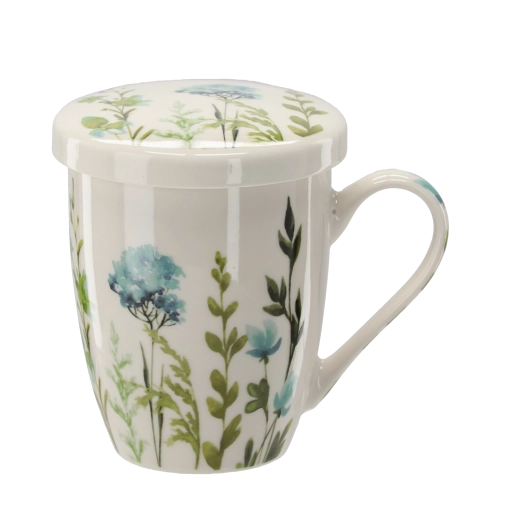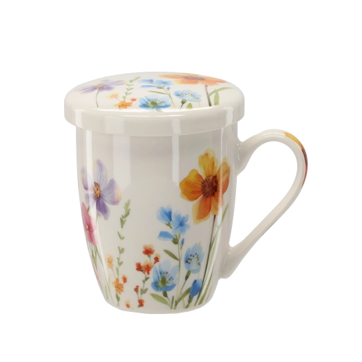 Stilska porcelanasta skodelica s prostornino 340 ml in praktičnim nerjavnim cedilom je idealna za pripravo razsutih čajev in zeliščnih napitkov. Vgrajeno cedilo omogoča udobno namakanje brez dodatnih pripomočkov, medtem ko porcelanast pokrov pijačo dlje ohranja toplo in zaščiteno. Cvetlični dizajn doda eleganco vsaki mizi, ergonomski ročaj pa zagotavlja prijeten oprijem pri vsakodnevni uporabi.