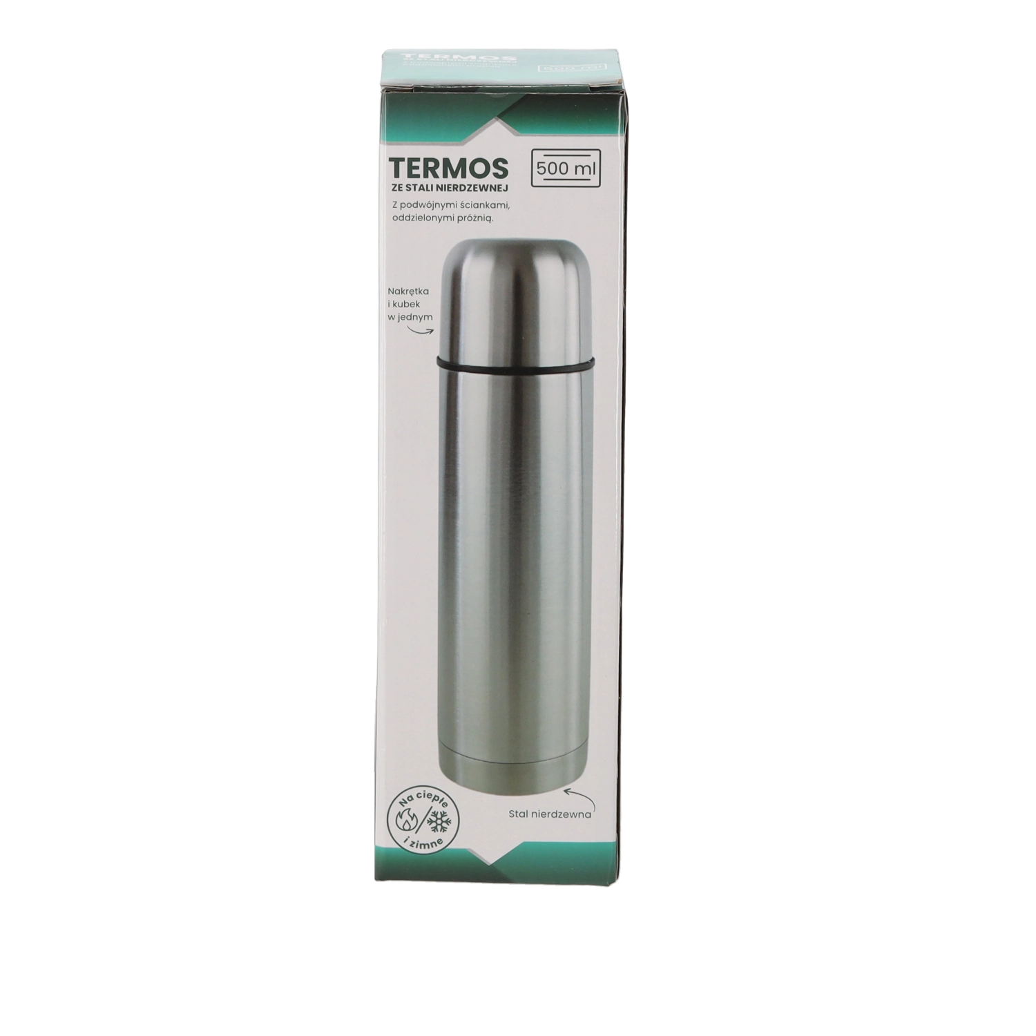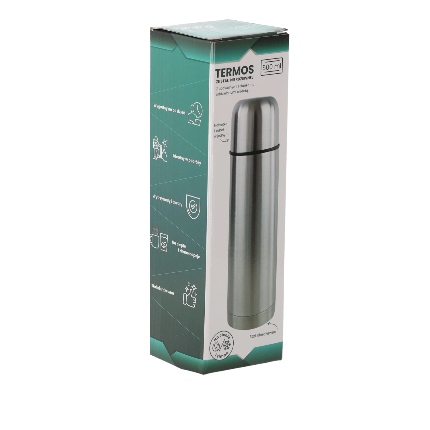 Praktična in vzdržljiva termovka s prostornino 500 ml ter dvojno steno iz nerjavnega jekla dolgo ohranja pijače tople ali hladne. Zahvaljujoč kakovostni izolaciji zagotavlja stabilno temperaturo do 24 ur, kompaktne mere in nizko težo za vsakodnevno uporabo na poti, v službi ali pri športu.