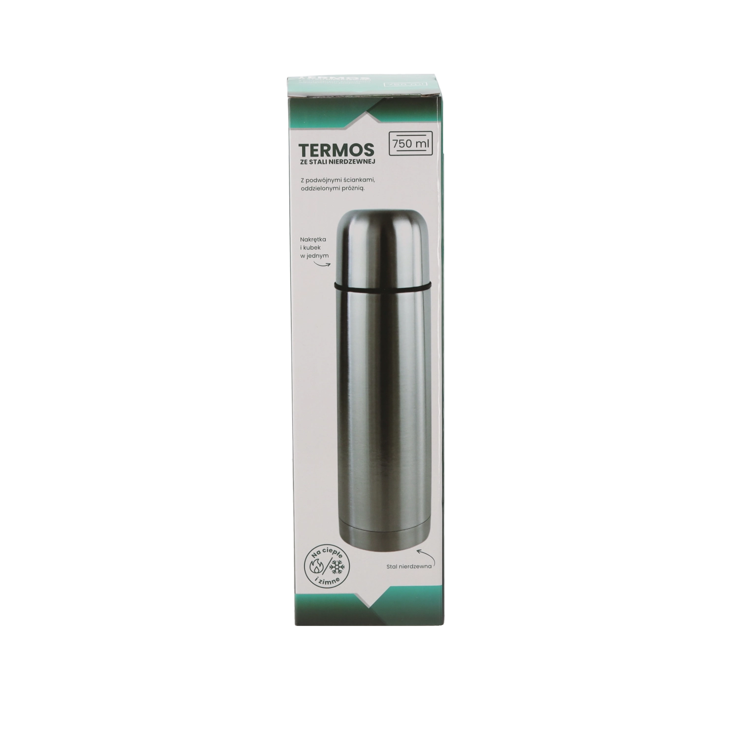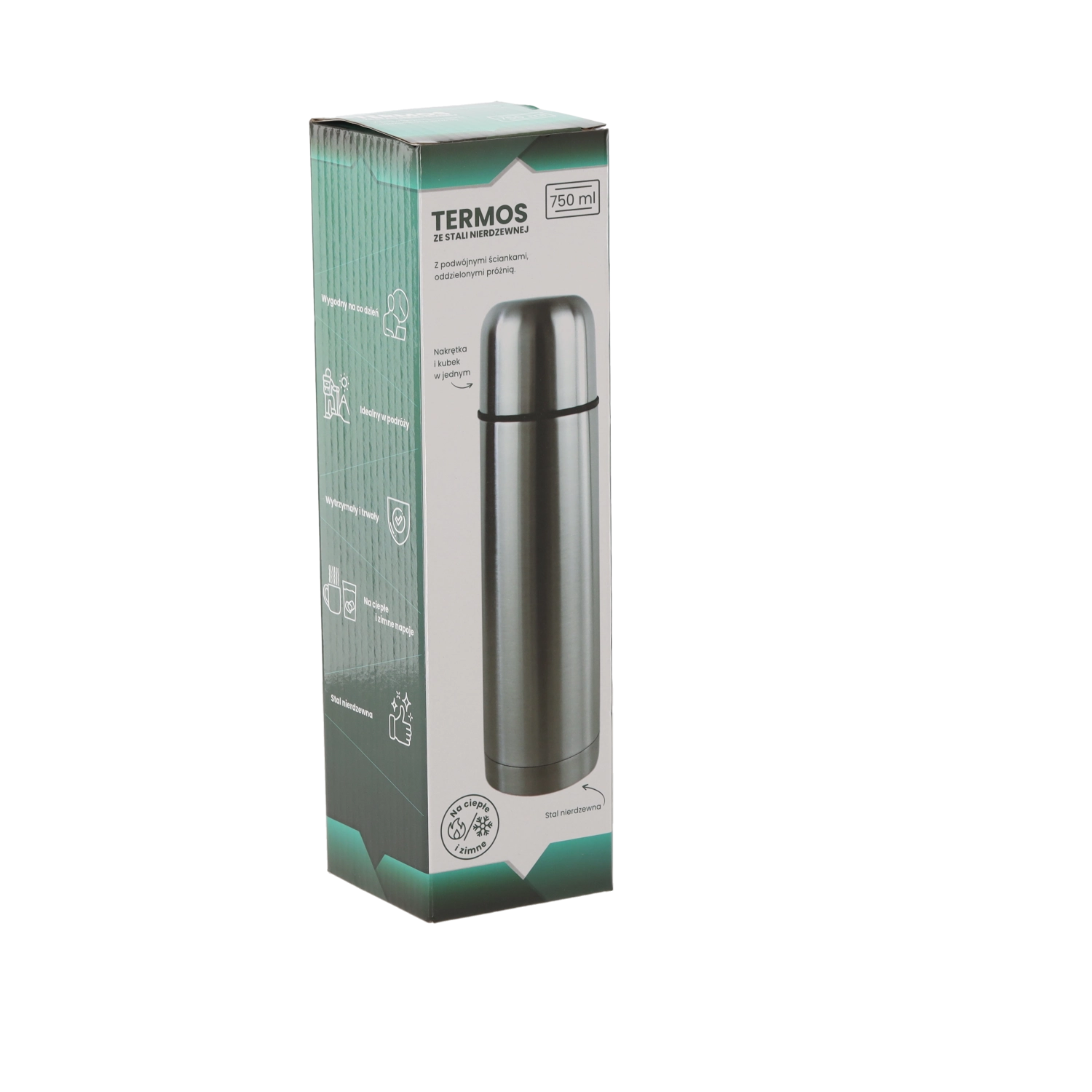 Praktična termovka s prostornino 750 ml z dvojno steno iz nerjavnega jekla dolgo ohranja vaše pijače tople ali hladne. Ponuja odlično toplotno izolacijo – po 24 urah ima pijača še vedno približno 40–43 °C. Ergonomska velikost in kakovostna izdelava zagotavljata vzdržljivost ter udobno uporabo doma, v službi in na poti.