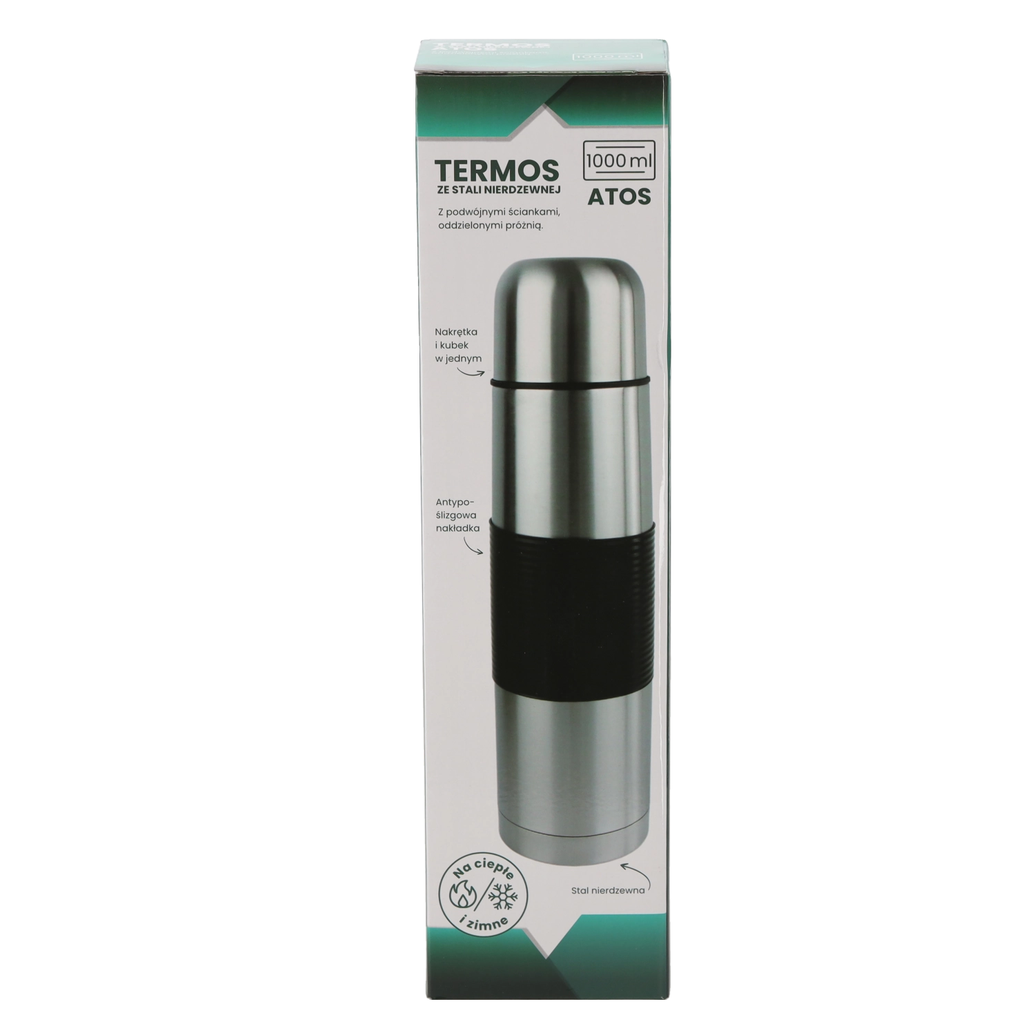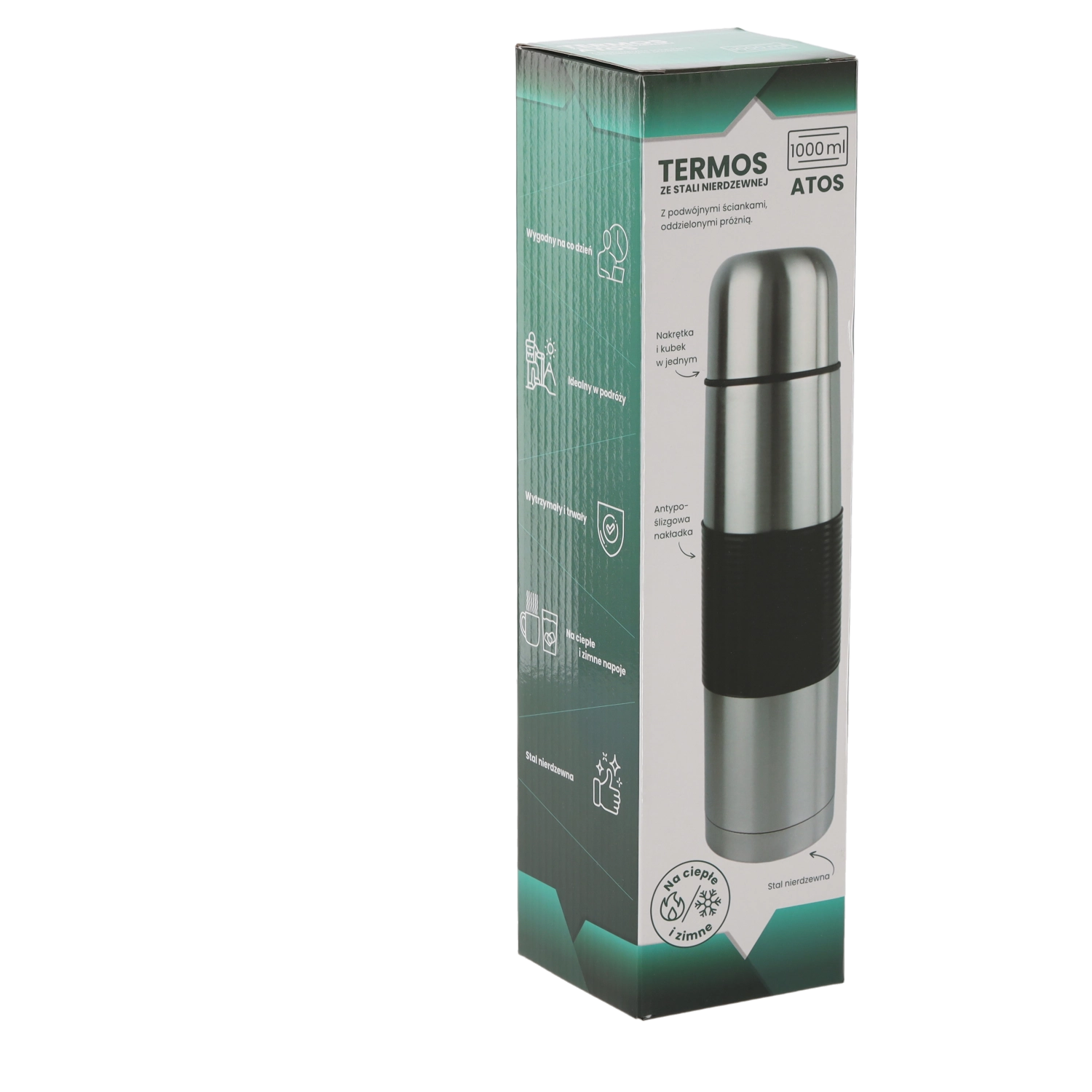 Termos ATOS 1000 ml je zanesljiva izbira za vsakodnevno uporabo. Zahvaljujoč dvoslojni konstrukciji iz nerjavečega jekla pijača dolgo časa ohranja stabilno temperaturo. Ergonomski silikonski, nedrseči oprijem zagotavlja varno in udobno držanje tudi z rokavicami.