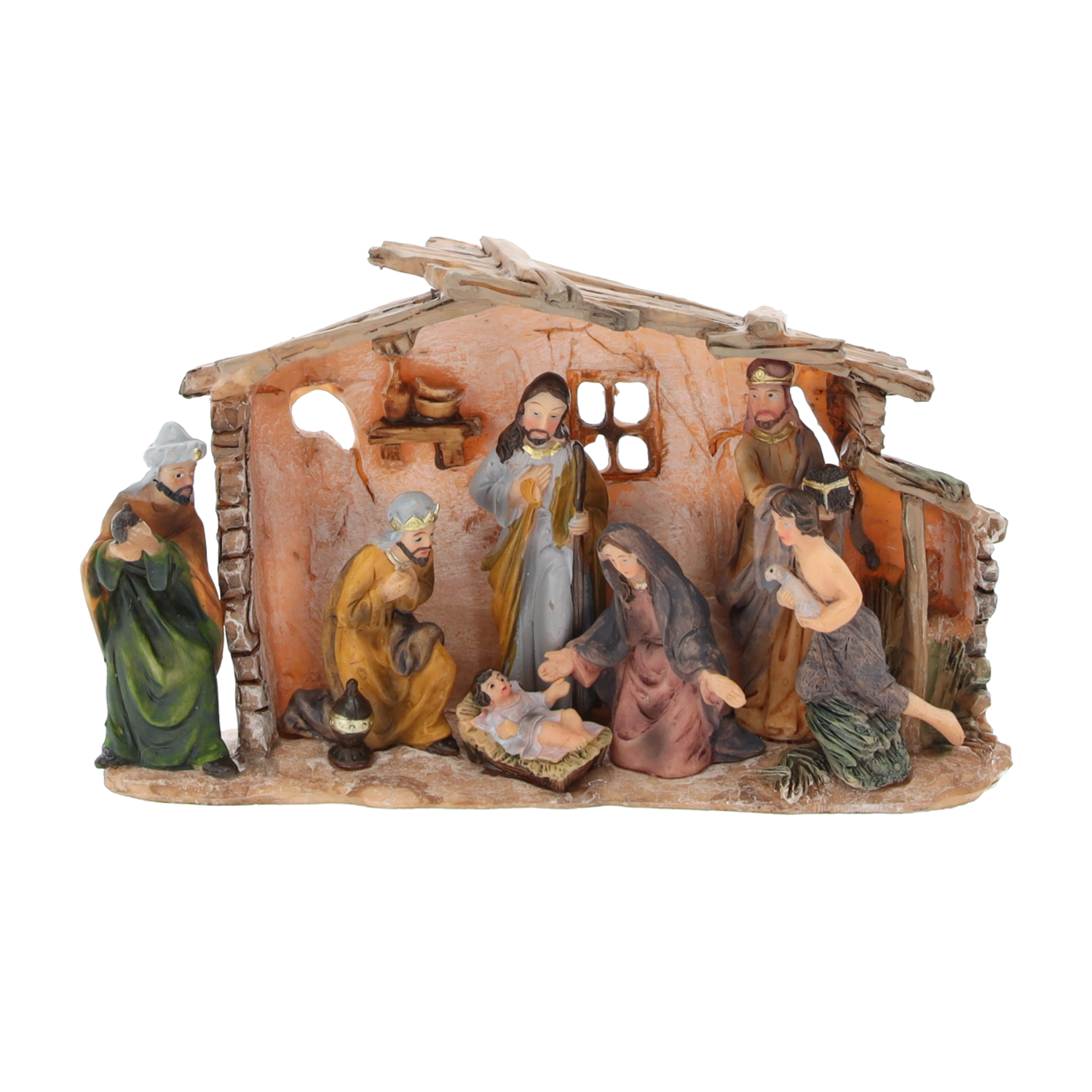 V dom prinesite praznično čarobnost z elegantnimi jaslicami, ki prikazujejo Sveto družino, pastirje in Tri kralje pod rustikalnim hlevčkom. Figurice so podrobno izdelane in ročno poslikane za edinstven videz. Kompaktne mere naredijo to dekoracijo idealno božično okrasje za komodo, polico ali kamin. Trpežna poliresinska smola zagotavlja dolgo življenjsko dobo in lep videz iz leta v leto.
