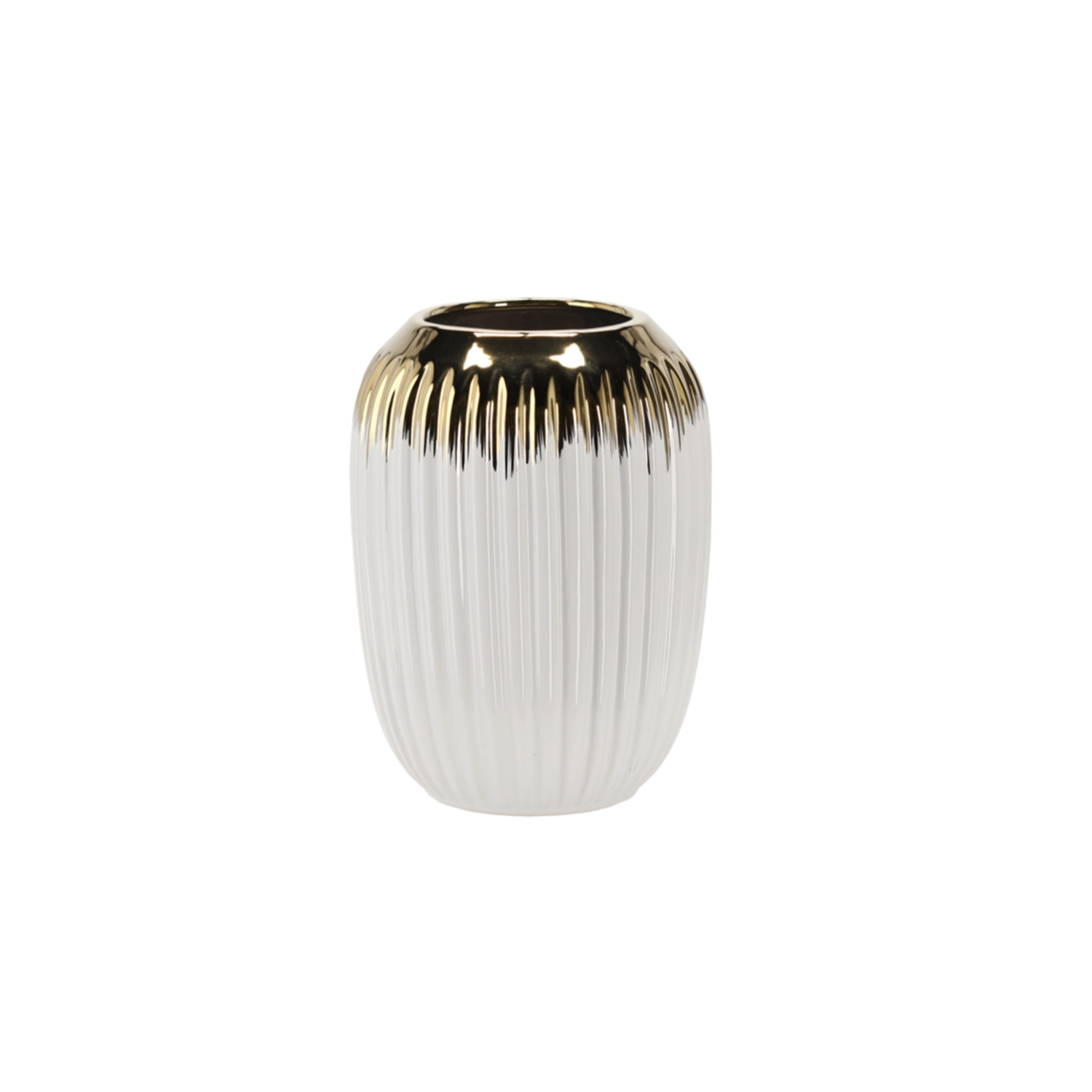 Ta stilska belo‑zlata vaza poudari lepoto svežega in suhega cvetja ter hkrati deluje kot izrazit dekorativni element. Keramična izdelava v kombinaciji z bleščečim zlatim poudarkom dopolnjuje moderen in klasičen interier.