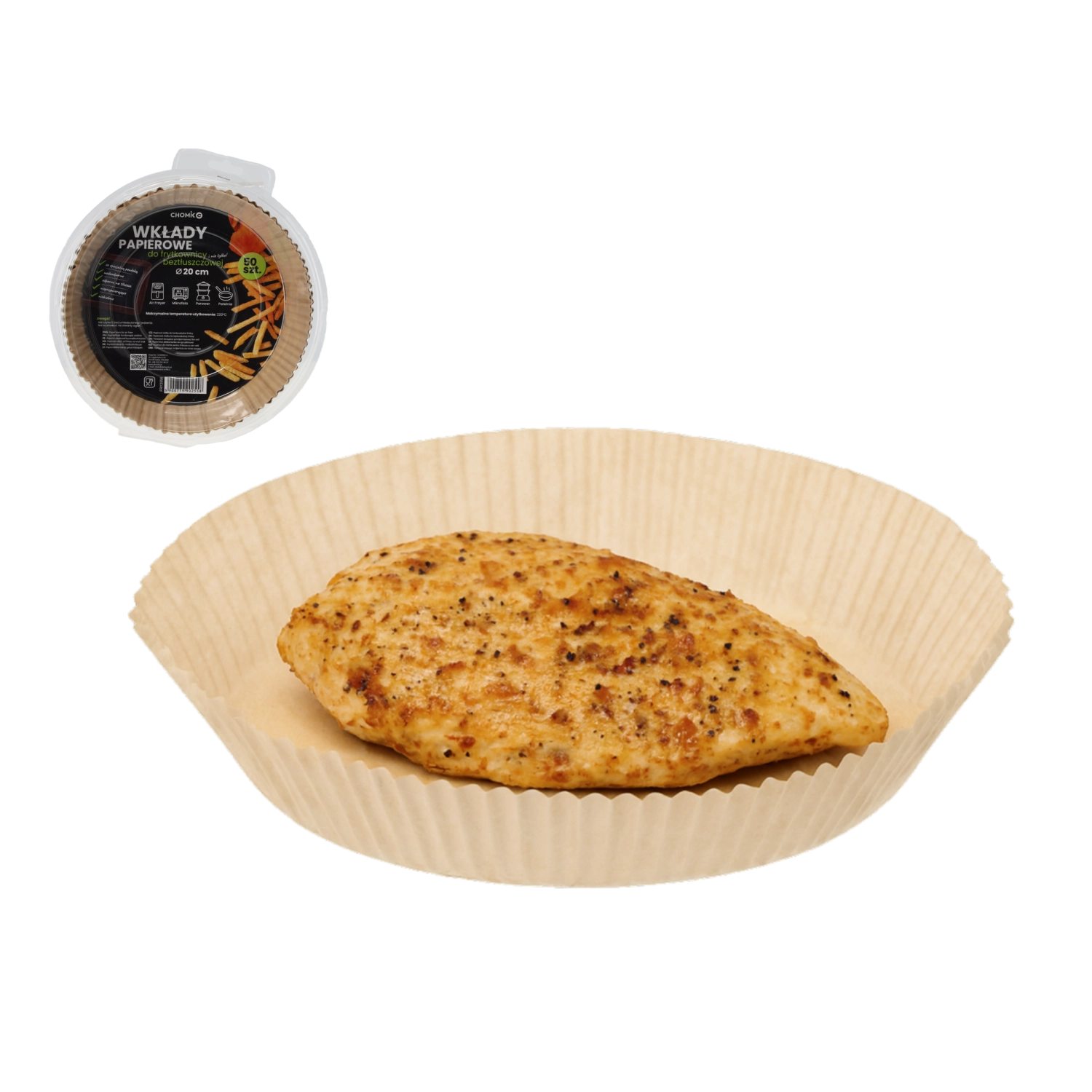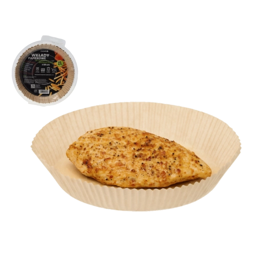 Te okrogle papirnate podlage v velikosti 20 × 4,5 cm olajšajo kuhanje in čiščenje. Nebeljen papir s posebno površinsko obdelavo preprečuje prepuščanje maščobe in vode ter zagotavlja zanesljiv nelepljiv učinek. Tako ujamejo drobtine in sokove, podaljšajo življenjsko dobo košare cvrtnika in prihranijo čas pri čiščenju.