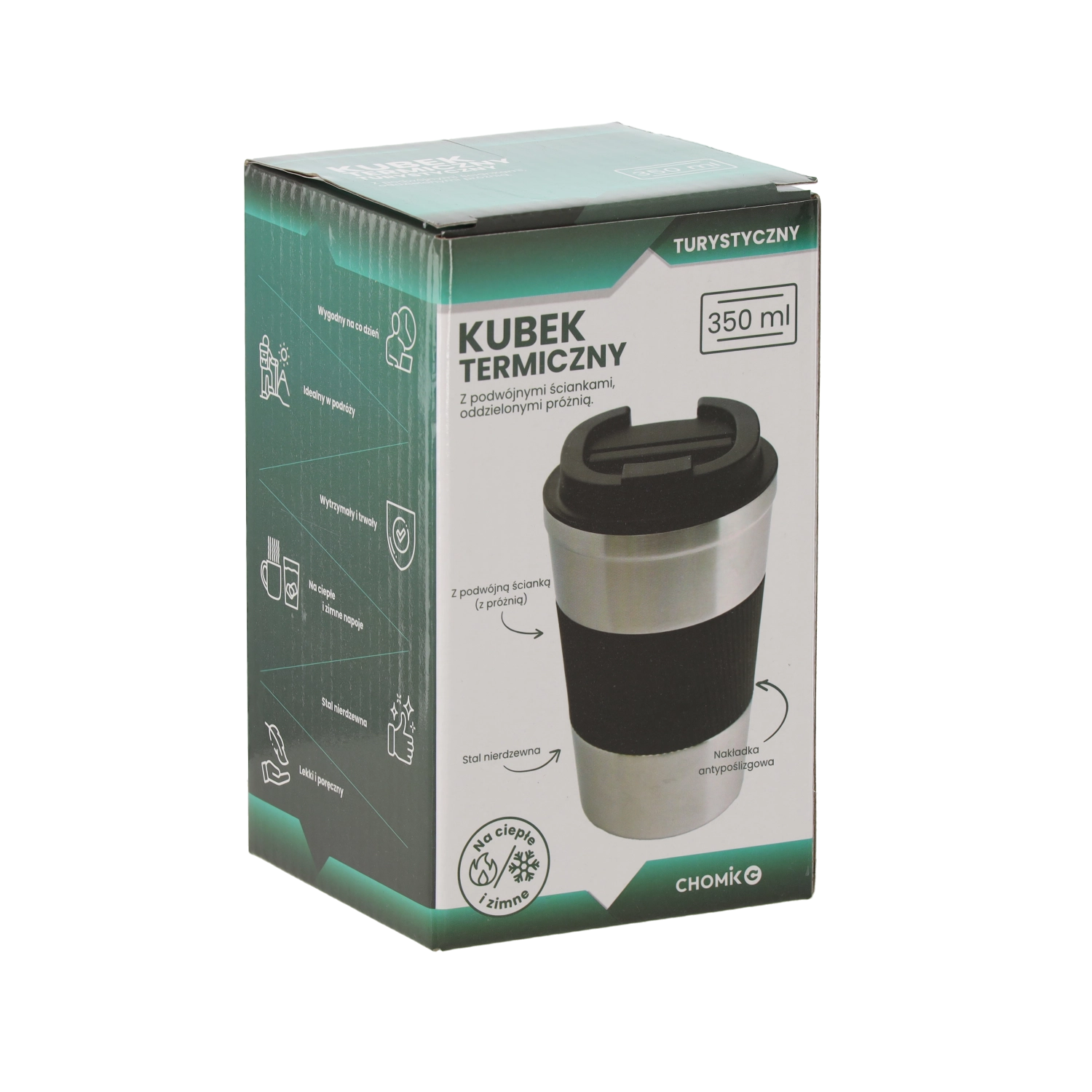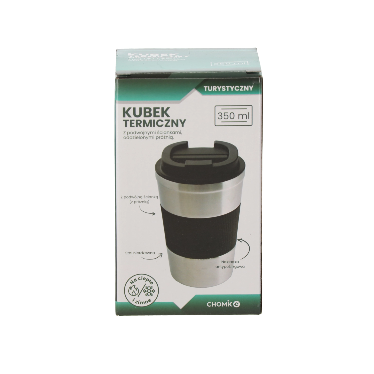 Praktičen termovrček s prostornino 350 ml iz kakovostnega nerjavnega jekla z vakuumsko zasnovo ohrani pijačo toplo ali hladno do 4 ure. Ima protizdrsni silikonski ovratnik za zanesljiv oprijem, navojni pokrov iz trpežnega PP in je primeren za pomivalni stroj. Eleganten videz v naravni barvi nerjavnega jekla je idealen za delo, avto in izlete.