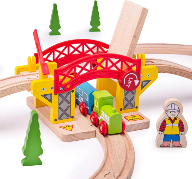 Uživajte v odlični zabavi z lesenim premičnim mostom, ki bo navdušil vsakega malega gradbenega inženirja. Premični most in vlaki na poti bodo razveselili otroško domišljijo.