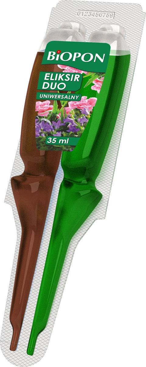 Biopon Eliksir Duo je pametna rešitev za slabo rastoče ali slabo cvetoče okrasne rastline. Dva ločena prekata hranita aktivne sestavine posebej, kar zagotavlja njihovo stabilnost in visoko učinkovitost. Mešanje poteka šele v substratu, kjer eliksir deluje ciljno in sinergijsko – rezultat je vidno boljše stanje, intenzivnejša barva listov ter daljše in bogatejše cvetenje.