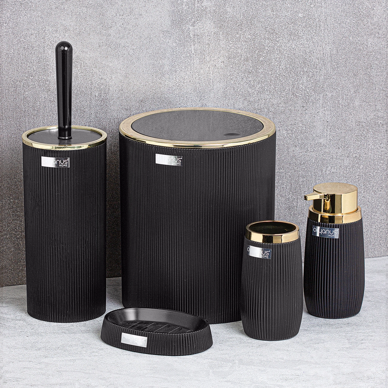 Elegantni okrogli kopalniški komplet iz odporne plastike v kombinaciji črne in zlate doda vaši kopalnici razkošen videz in praktičnost. V paketu najdete 5 osnovnih dodatkov za vsakodnevno higieno: koš za odpadke, WC ščetko, dozirnik za milo, lonček za ščetko in posodico za milo. Enostavno vzdrževanje, lahki materiali in stilski detajli za popolnoma usklajen videz.