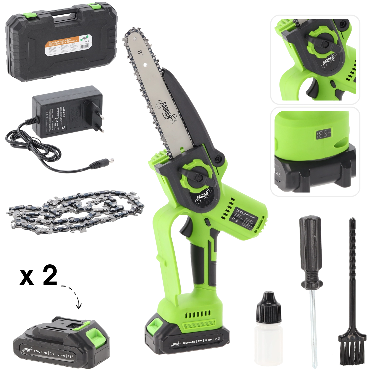 Kompaktna in zmogljiva akumulatorska mini verižna žaga za enostavno obrezovanje vej, grmovja in lažja lesarska dela. Zahvaljujoč brezkrtačnemu motorju, meču 20 cm in hitrosti 4500 vrt/min omogoča gladek in hiter rez brez kablov. V paketu je vse potrebno, vključno z 2 baterijama, polnilnikom in nadomestno verigo za neprekinjeno delo na vrtu.