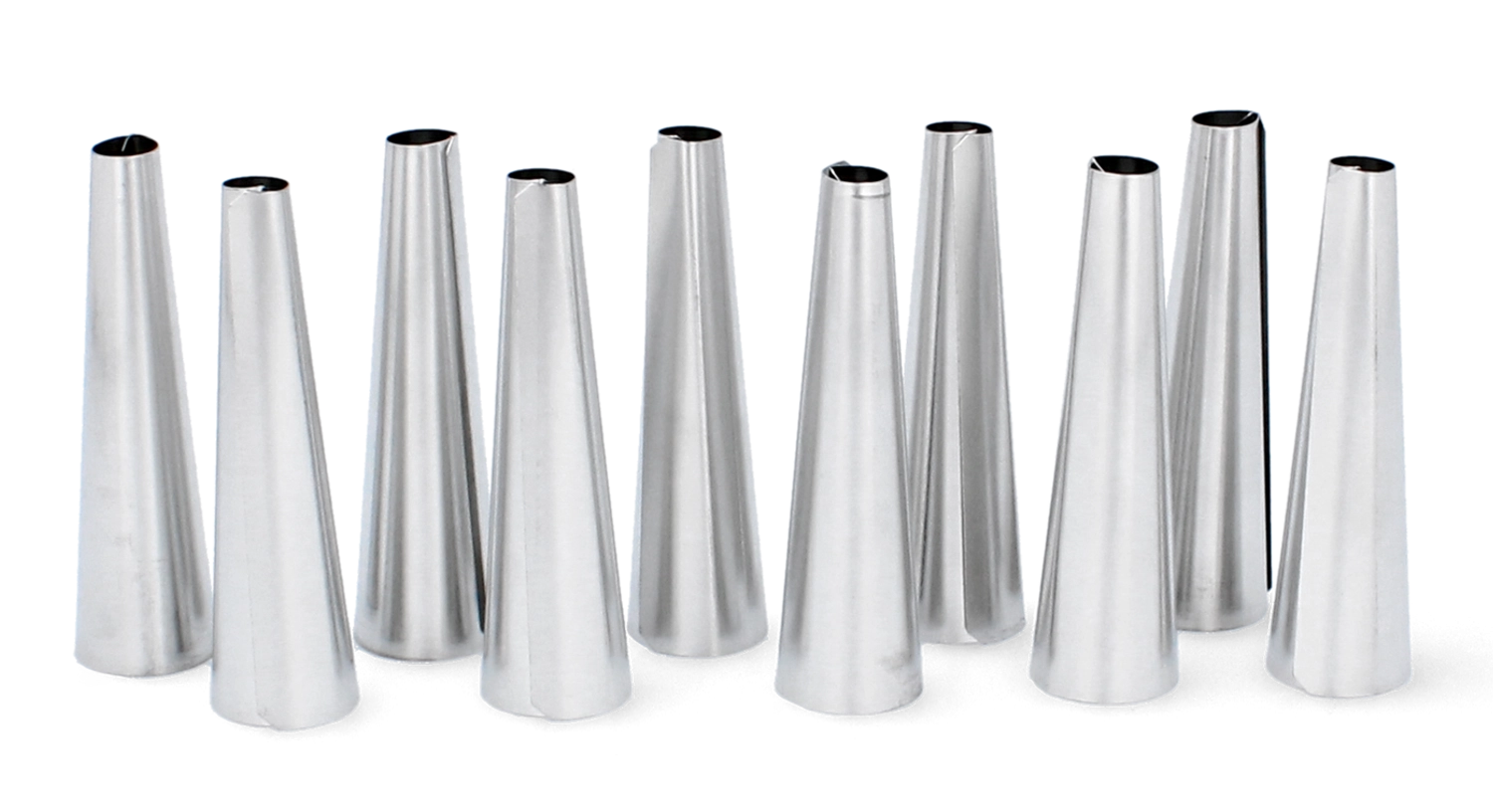 Praktičen set 10 modelčkov za peko kremšnit iz odpornega jekla vam omogoča ustvariti popolno oblikovane rolice za sladke in slane nadeve. Zaradi stožčaste oblike in kompaktnih mer se testo zlahka oblikuje in po peki preprosto sname. Modelčki so iz visokokakovostnega materiala, prenesejo temperature do 230 °C, so odporni, enostavni za čiščenje in primerni za večkratno uporabo.