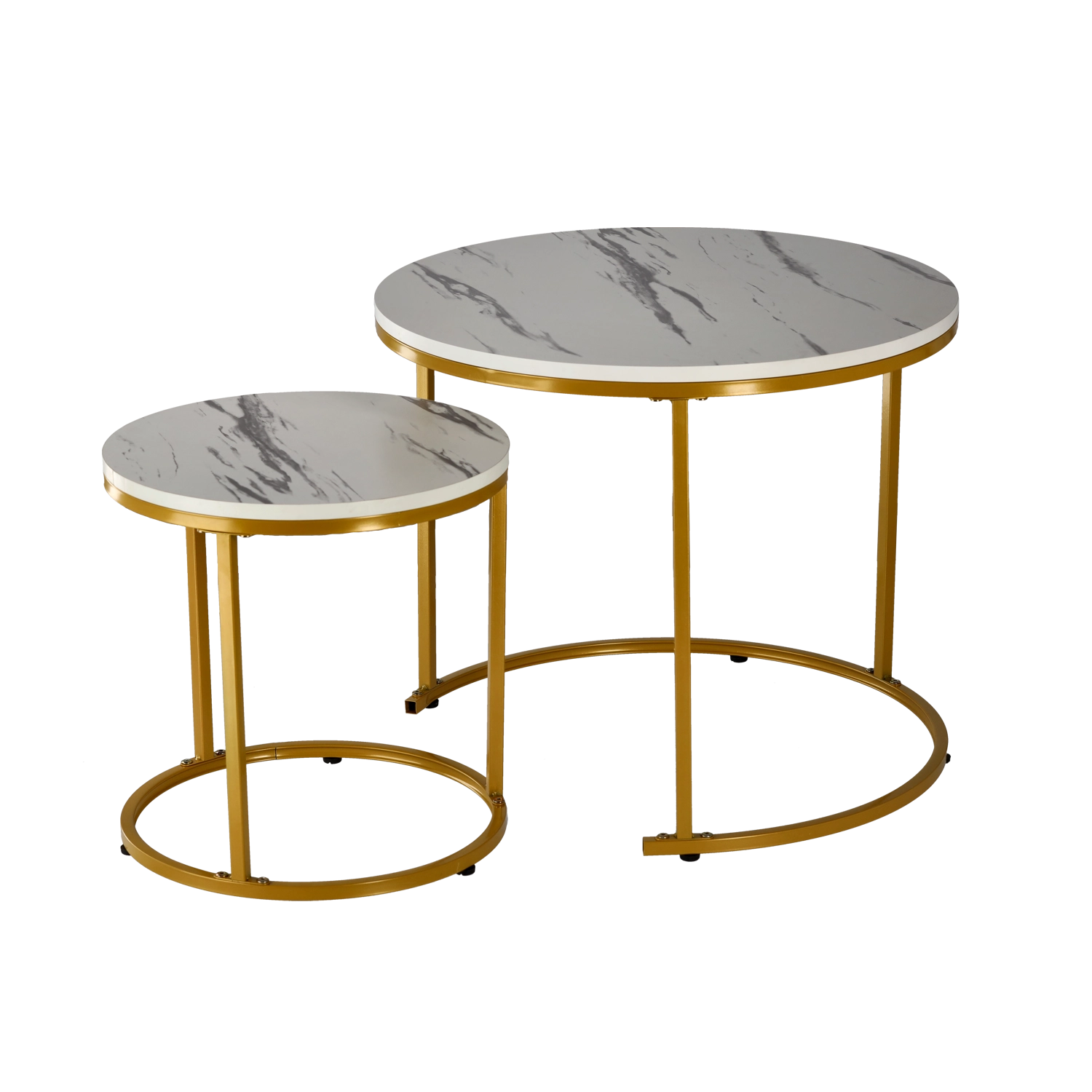 Elegantni set dveh okroglih klubski miz združuje sodoben dizajn, marmornat videz plošče in zlato kovinsko konstrukcijo. Manjša mizica se lahko delno pomakne pod večjo za prihranek prostora, kar je praktična in stilska rešitev za dnevno sobo, spalnico in delovni kotiček. Trpežni materiali in enostavno čistljiva površina olajšajo vsakodnevno uporabo.