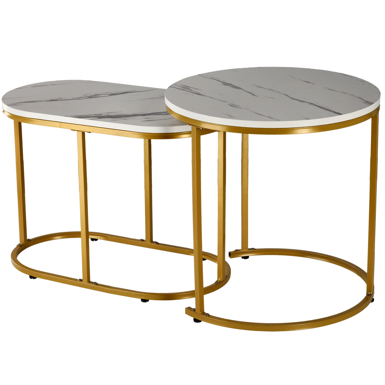 Ta dvodelni komplet vključuje večjo okroglo in manjšo ovalno mizo, ki ju lahko uporabljate skupaj ali ločeno. Vzdržljiva kovinska osnova z zlatim premazom zagotavlja stabilnost, medtem ko se gladke plošče z imitacijo belega marmorja enostavno čistijo in delujejo razkošno.