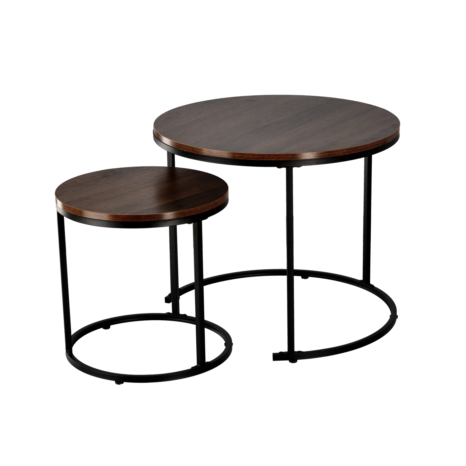 Set dveh mizic prinaša prilagodljivost in stil v vsak dnevni prostor. Manjšo mizico lahko delno pomaknete pod večjo, s čimer prihranite prostor in dobite udoben dostop s kavča. Stabilen kovinski okvir v črni barvi in enostavno vzdrževana plošča z lesnim dekorjem tvorita brezčasno kombinacijo, ki poudari značaj vašega interierja.