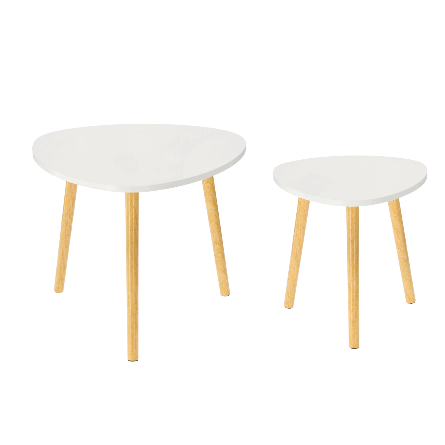 Stilski komplet dveh klubski mizic v kombinaciji bele plošče in naravnih lesenih nog prinaša skandinavski minimalizem, lahkotno obliko in praktično prilagodljivost v vsak interier. Neenakomerno trikotna/zaobljena oblika deluje izvirno in se poda v dnevno sobo, spalnico ali delovni kotiček.