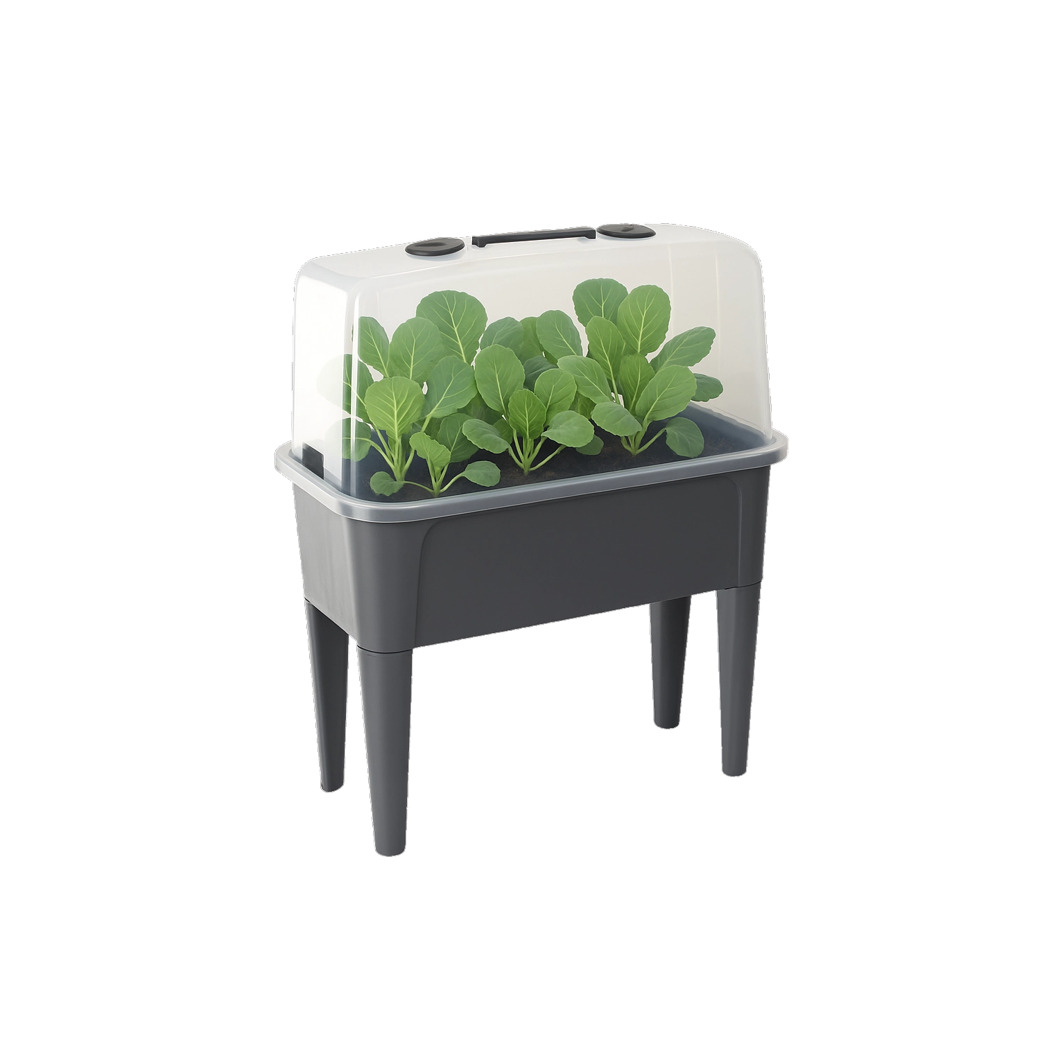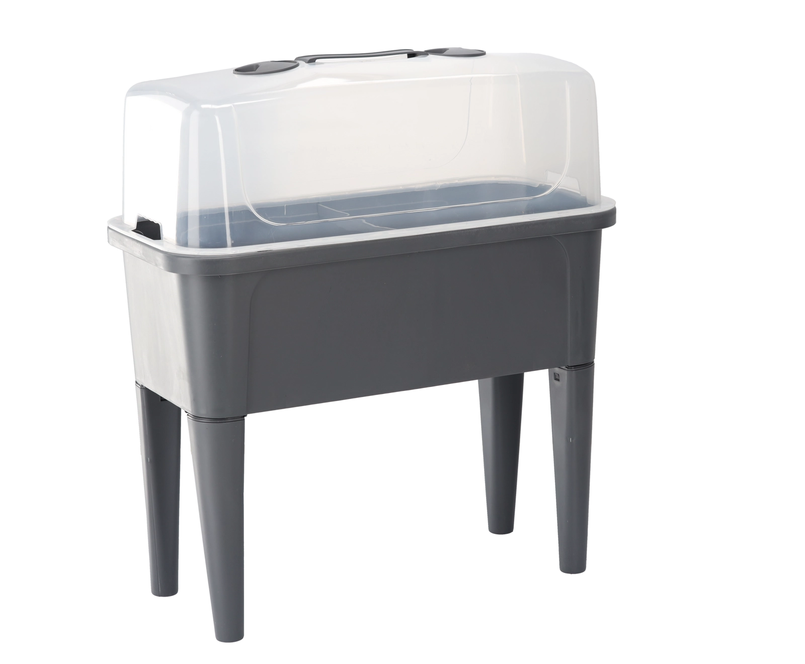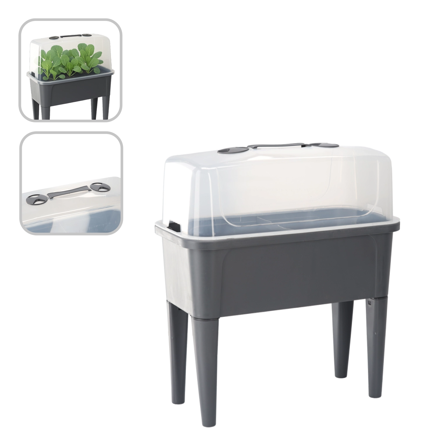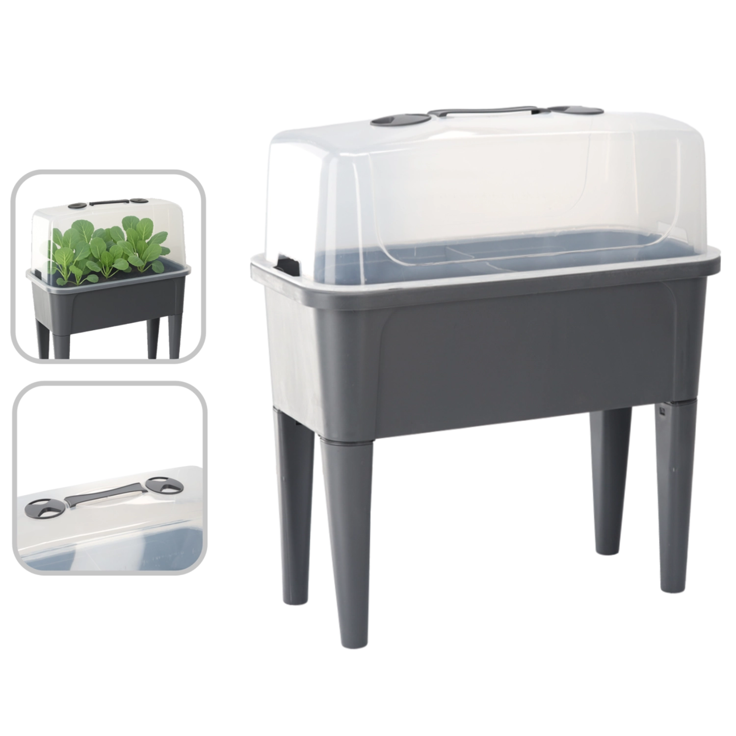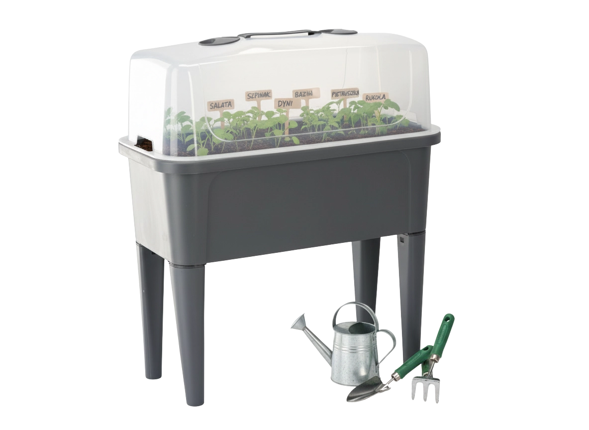 Praktični mini rastlinjak na nogicah združuje udobje povišane grede z učinkovito zaščito pred vremenskimi vplivi. Prozorna kupola ohranja stalno toploto in vlago za hiter začetek setev, ukoreninjanje potaknjencev in gojenje zelišč. Zahvaljujoč prezračevalnim odprtinam na pokrovu imate pretok zraka popolnoma pod nadzorom.