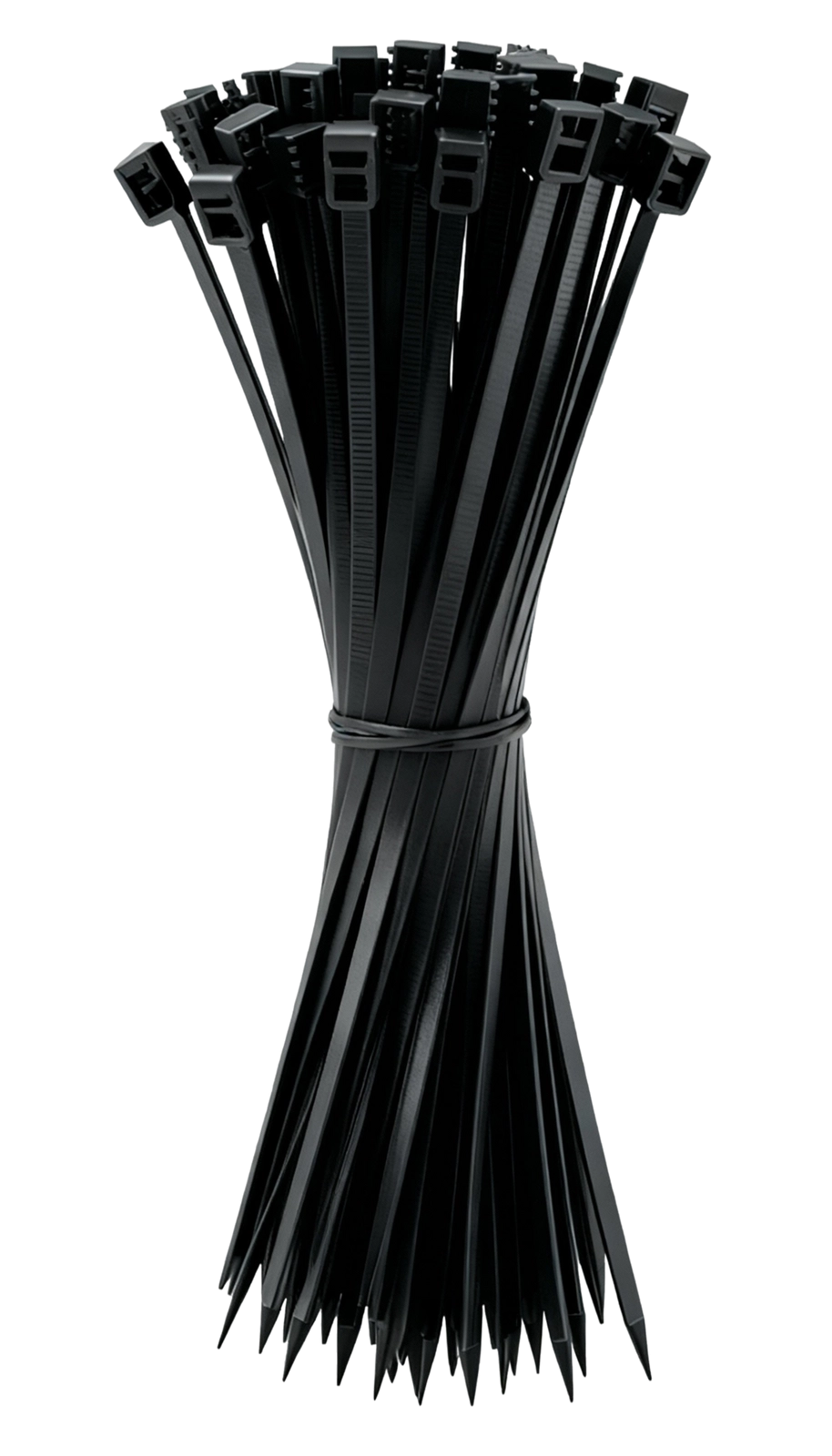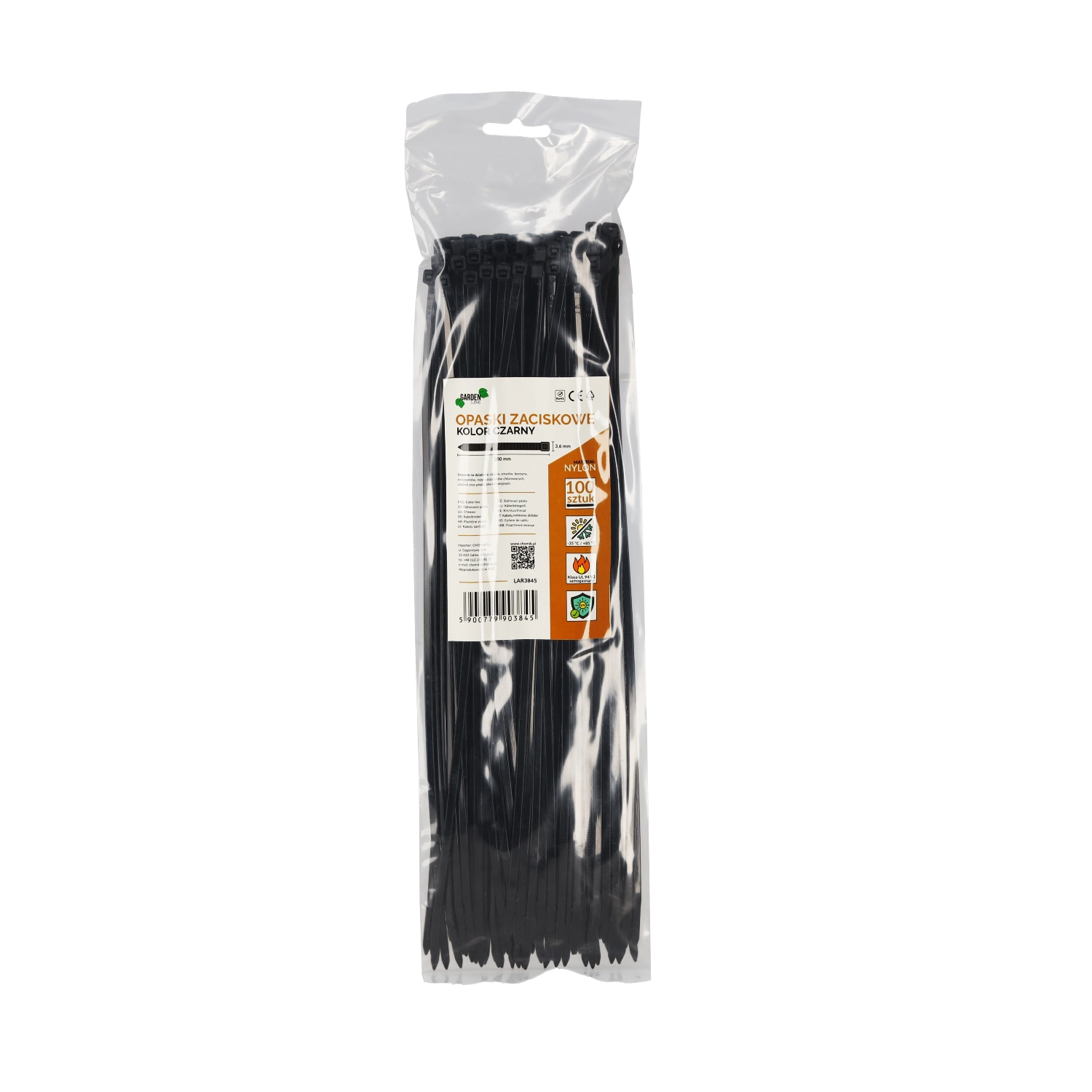 Praktičen komplet črnih vezic dimenzij 3,6 × 300 mm za univerzalno uporabo v gospodinjstvu, delavnici in industriji. Izdelane so iz kakovostnega najlona s samougasljivo klasifikacijo UL 94 V2, z odpornostjo proti UV-sevanju in širokim temperaturnim območjem uporabe. Vezice so odporne na olja, maziva, bencin in detergente, pakiranje vsebuje 100 kosov.