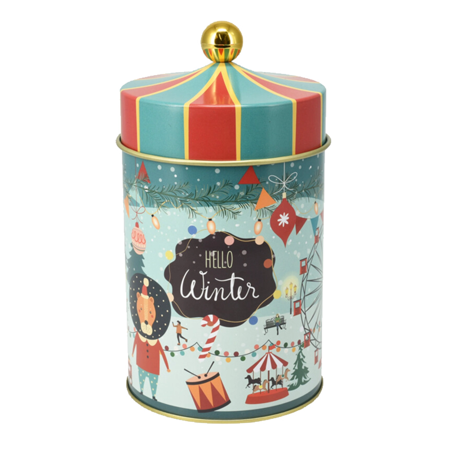 Ta okrogla kovinska škatla združuje praktično shranjevanje z očarljivo zimsko zasnovo. Trdna izdelava iz odporne kovine in dobro prilegajoč pokrov pomagata varovati priboljške pred vlago in zrakom, zato ostanejo dlje časa hrustljavi in dišeči. Kompaktne mere olajšajo postavitev na kuhinjski pult, polico ali v shrambo.