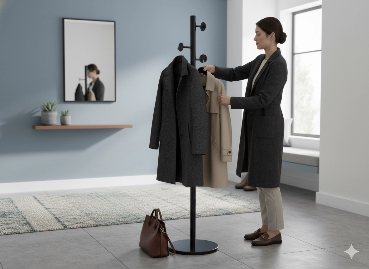 Težka marmornata baza preprečuje prevrnitev in ohranja obešalnik stabilen tudi pri polni obremenitvi s plašči in torbami.