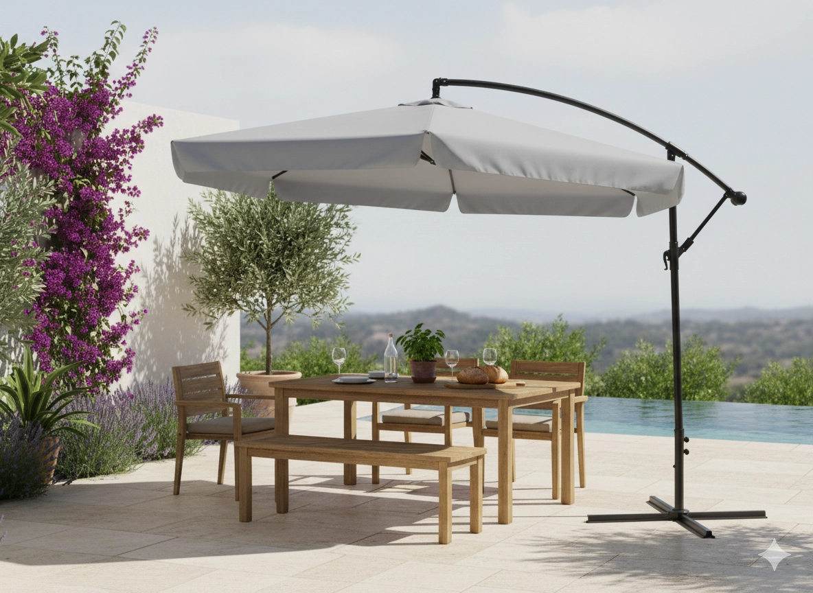 Moderna konstrukcija tipa BANANA brez sredinskega droga sprosti prostor pod senčnikom in polepša sedenje za jedilno mizo ter počitek na ležalniku. Široka senčilna površina 300 cm (pribl. 350 cm glede na prekrivno tkanino) nudi zanesljivo senco za družino in prijatelje, medtem ko prezračevalna odprtina v baldahinu izboljša kroženje zraka in zmanjša upor vetra.