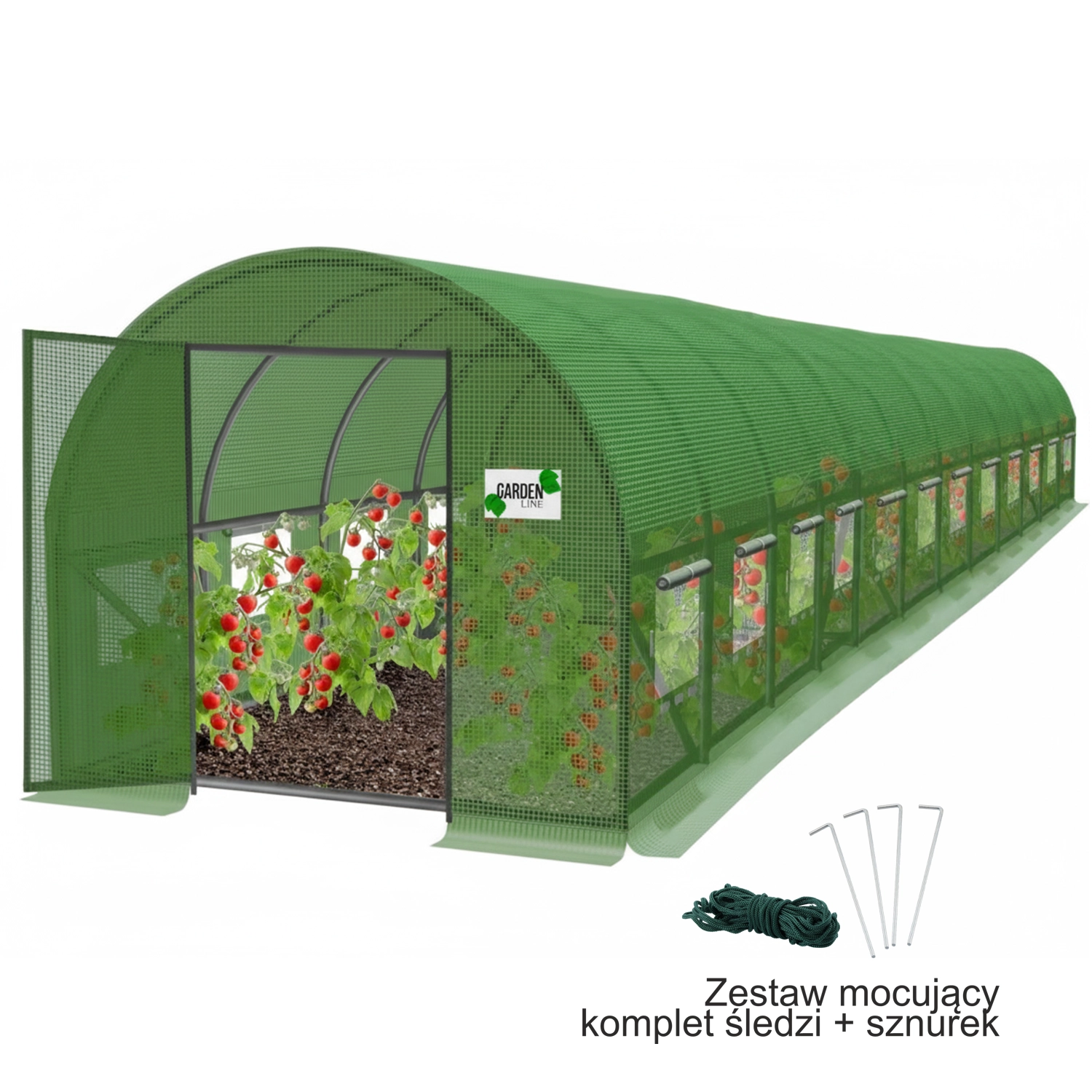 Močan pocinkan okvir iz cevi Ø 25 mm (debelina 0,65 mm) z talnim robom in ključki v paketu zagotavlja stabilnost. 24 prezračevalnih oken z mrežo proti komarjem omogoča uravnavanje pretoka zraka, zmanjšanje vlage in zaščito pred insekti. Dodatne zgornje palice olajšajo oporo vzpenjavim rastlinam (paradižnik, kumare, grah).
