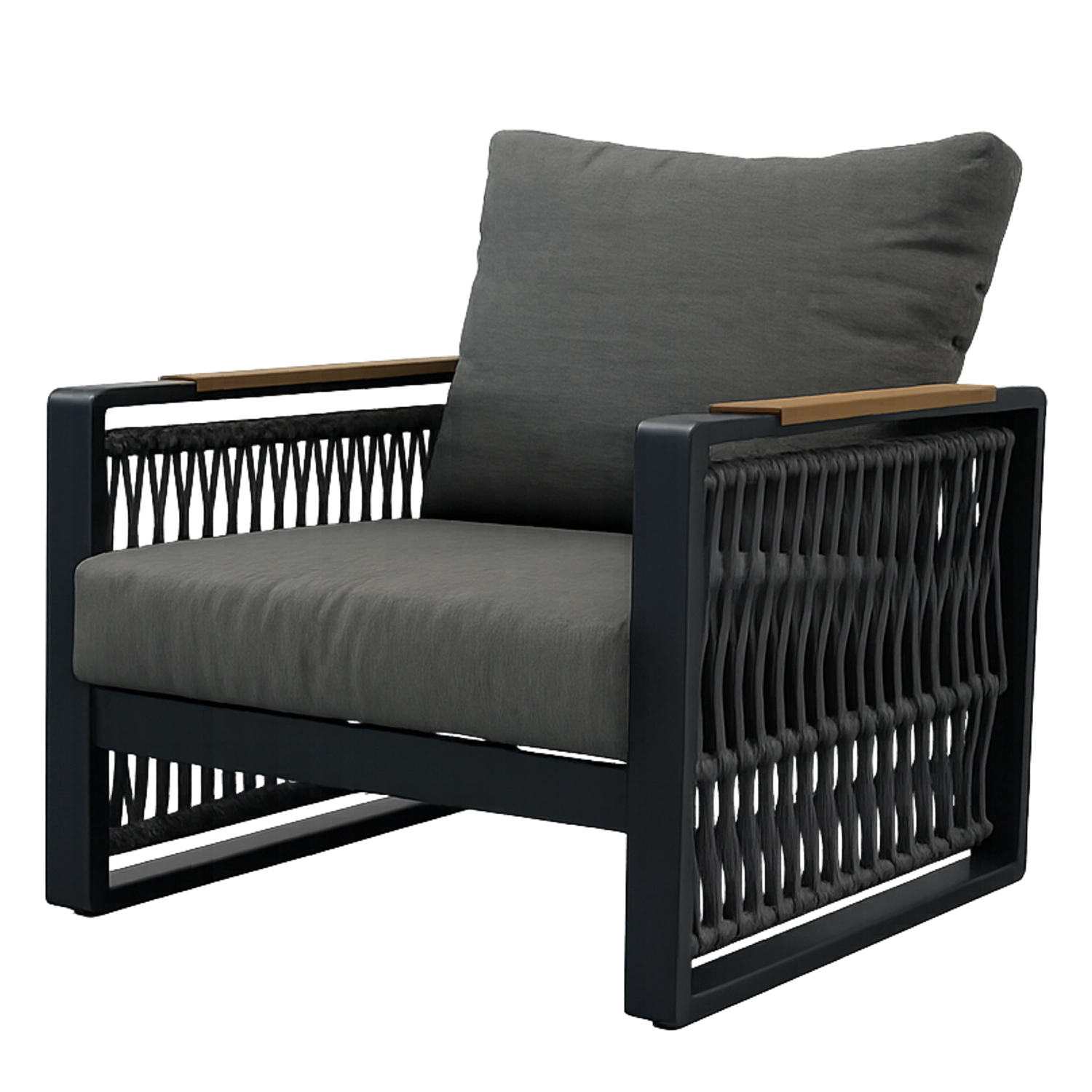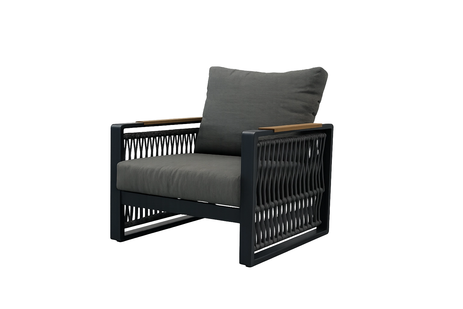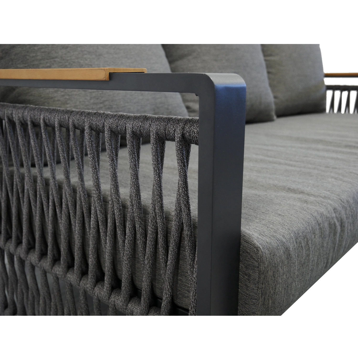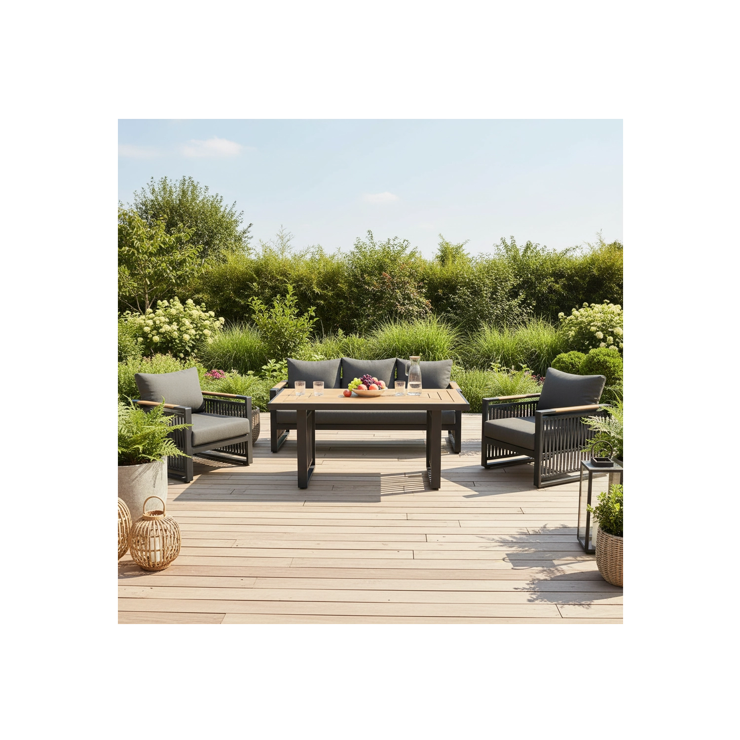 Set SKOPJE je zasnovan za vsakodnevni počitek in prijetna druženja. Lahki, a čvrsti aluminijasti okvirji s prašnim lakom kljubujejo vremenu, medtem ko dizajnerski vrvni opleten vzorec in lesni dekor polywood na naslonih za roke ter mizni plošči poudarjata prestižen značaj celotnega sestava.