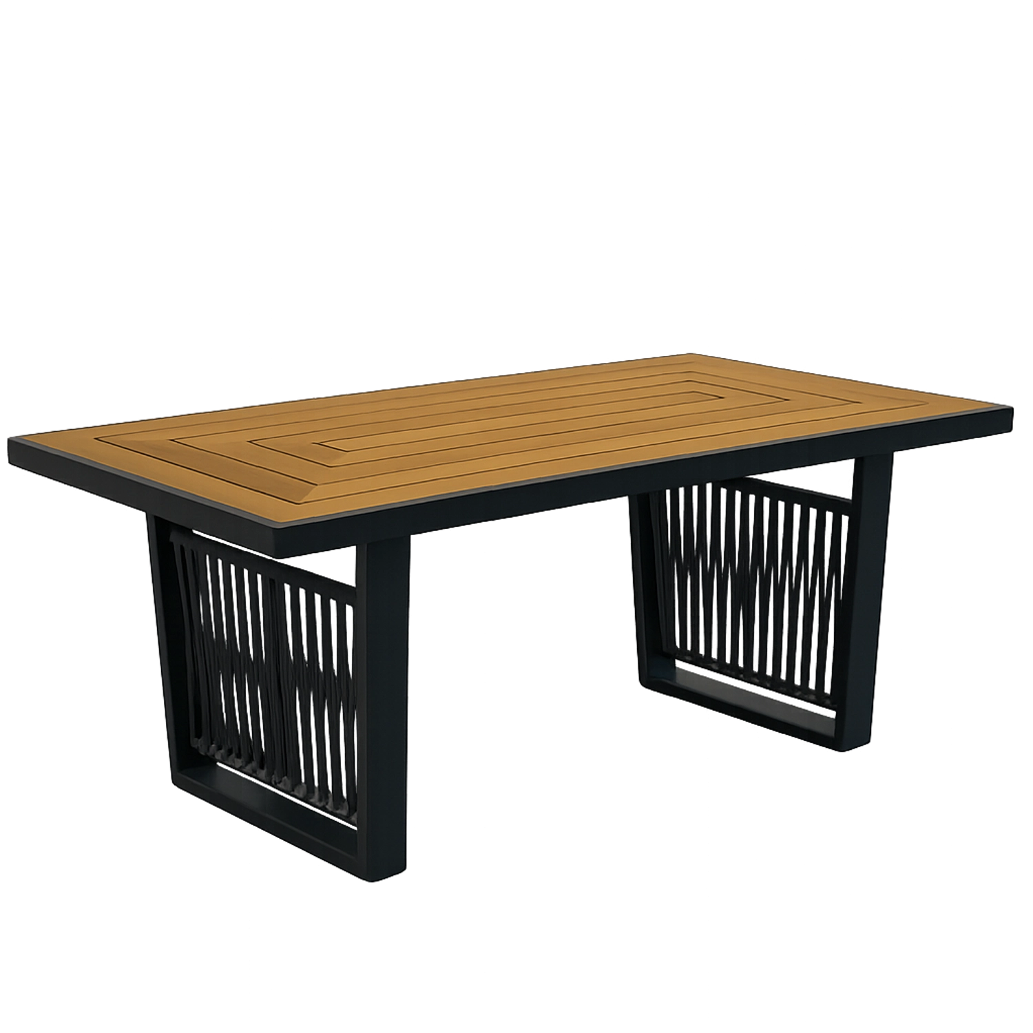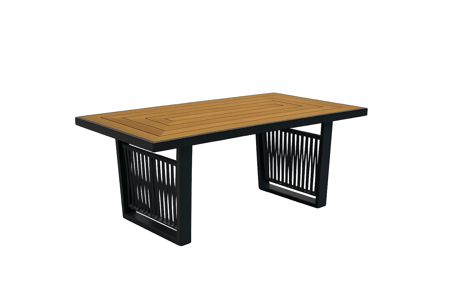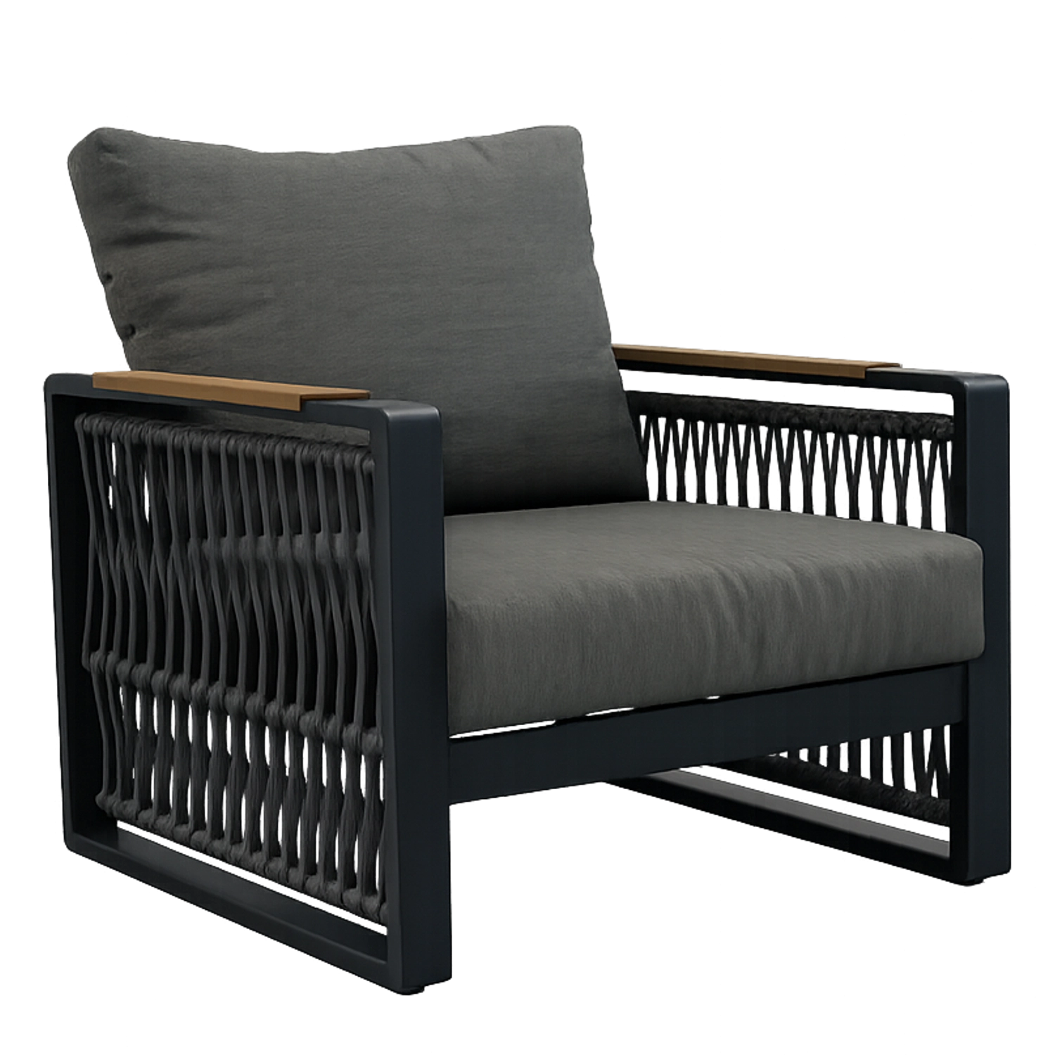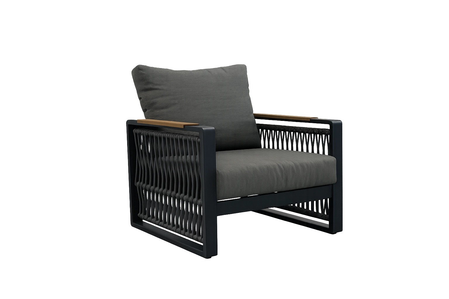 Set SKOPJE je zasnovan za vsakodnevni počitek in prijetna druženja. Lahki, a čvrsti aluminijasti okvirji s prašnim lakom kljubujejo vremenu, medtem ko dizajnerski vrvni opleten vzorec in lesni dekor polywood na naslonih za roke ter mizni plošči poudarjata prestižen značaj celotnega sestava.