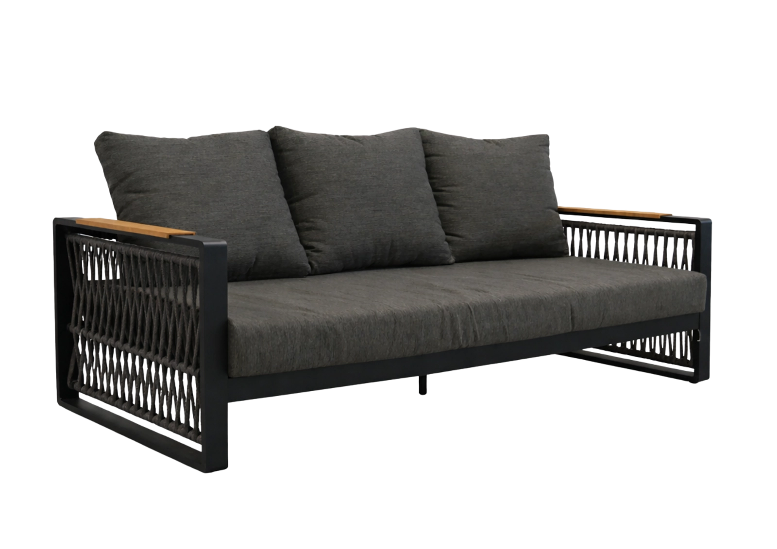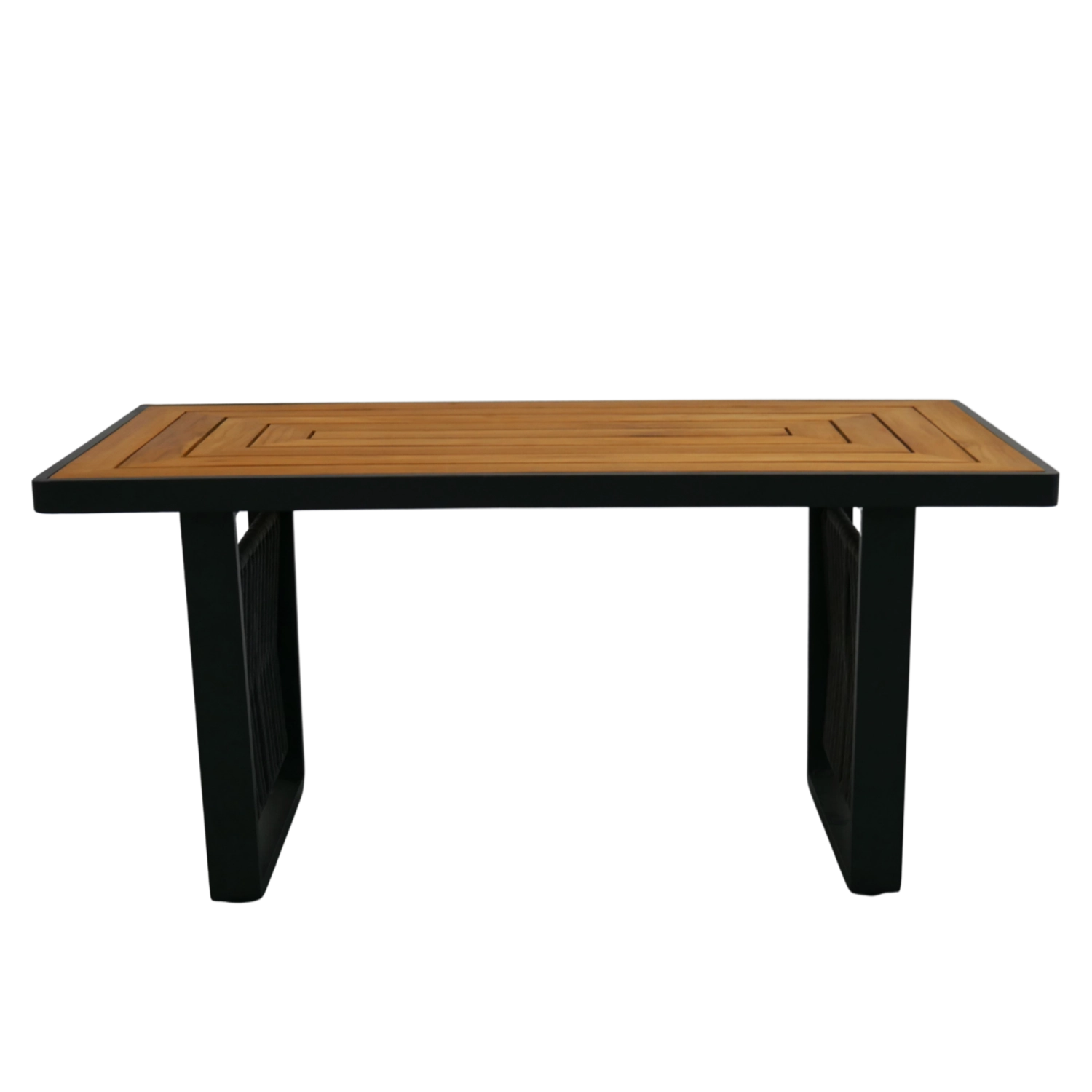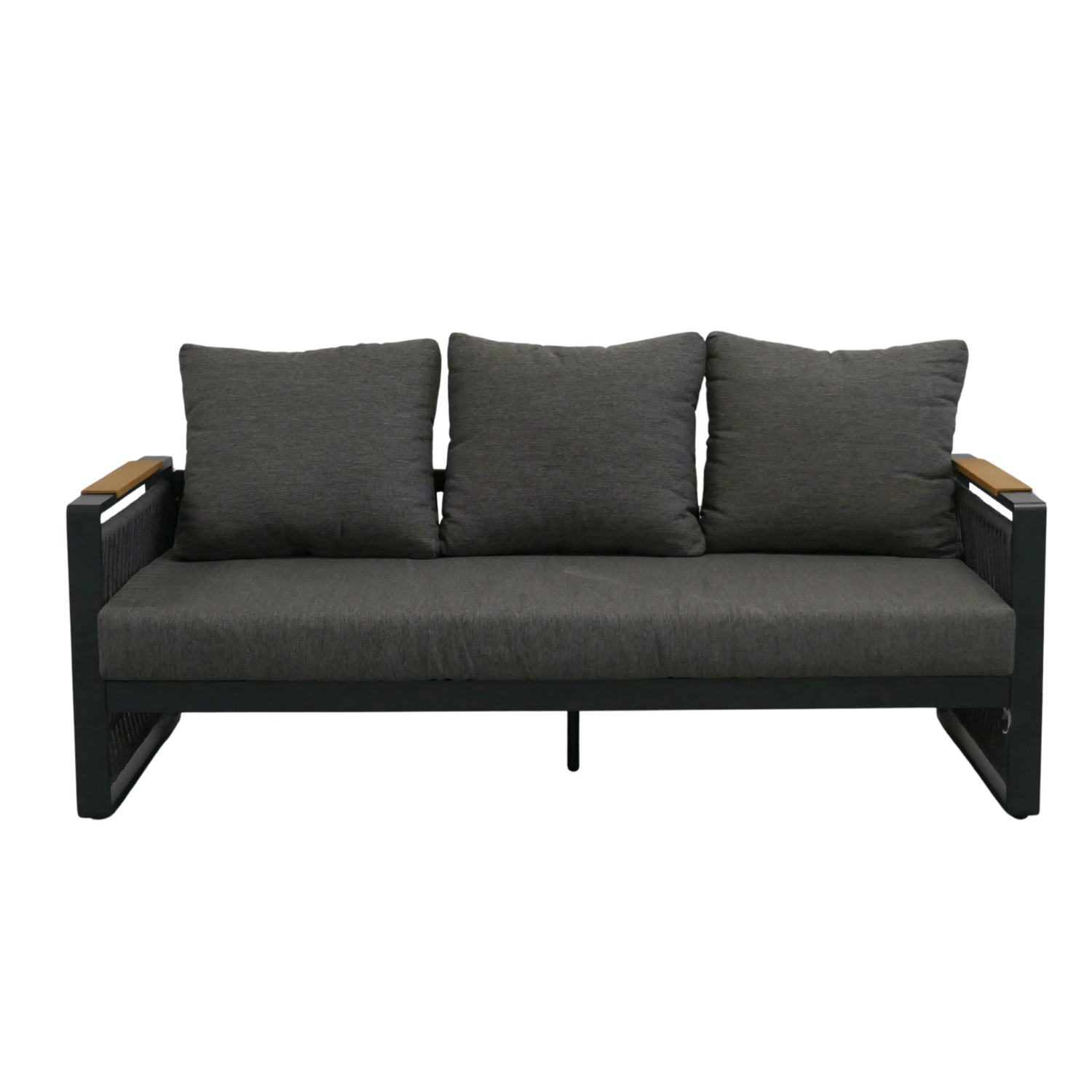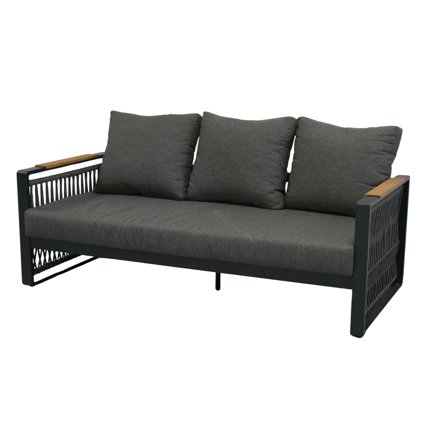 Set SKOPJE je zasnovan za vsakodnevni počitek in prijetna druženja. Lahki, a čvrsti aluminijasti okvirji s prašnim lakom kljubujejo vremenu, medtem ko dizajnerski vrvni opleten vzorec in lesni dekor polywood na naslonih za roke ter mizni plošči poudarjata prestižen značaj celotnega sestava.