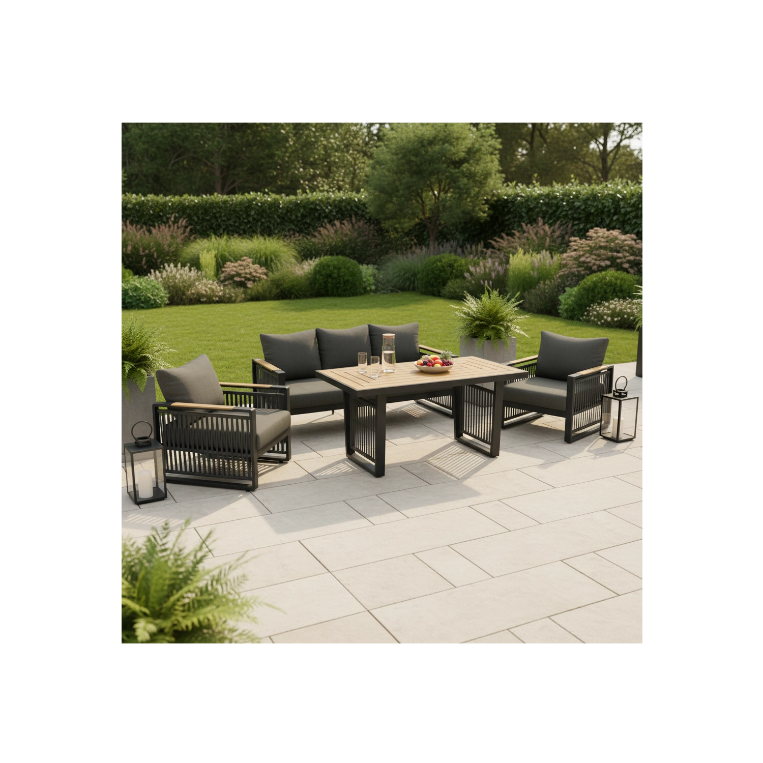 Debełe 12 cm blazine na sedalih in naslonih zagotavljajo vrhunsko udobje in stabilno oporo hrbtu. Sestav je idealen za 4–5 oseb in se odlično poda na vrt, teraso ali patio – za jutranjo kavo, popoldanski počitek ali večerno druženje s prijatelji.