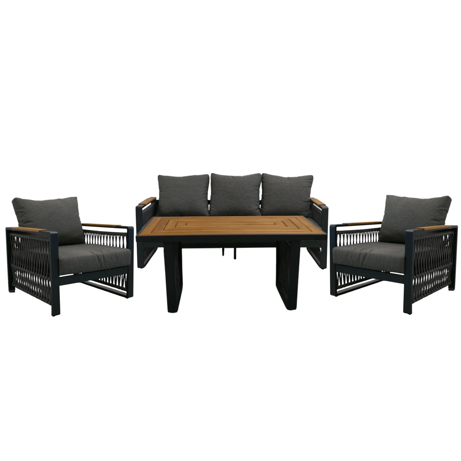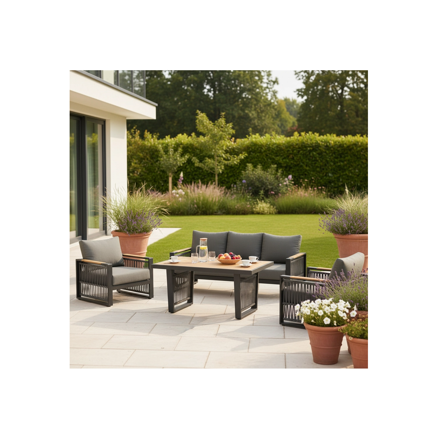 Ustvarite si trendovski kotiček za sprostitev na terasi ali vrtu. Ta 4-delni vrtni lounge set združuje vzdržljivo aluminijasto konstrukcijo, modernen opleten vzorec iz okrogline vrvi ter izjemno debele 12 cm blazine za vrhunsko udobje. Detajli iz polywooda dodajo eleganten, brezčasen videz, ki se poda tako modernim kot klasičnim zunanjim prostorom.