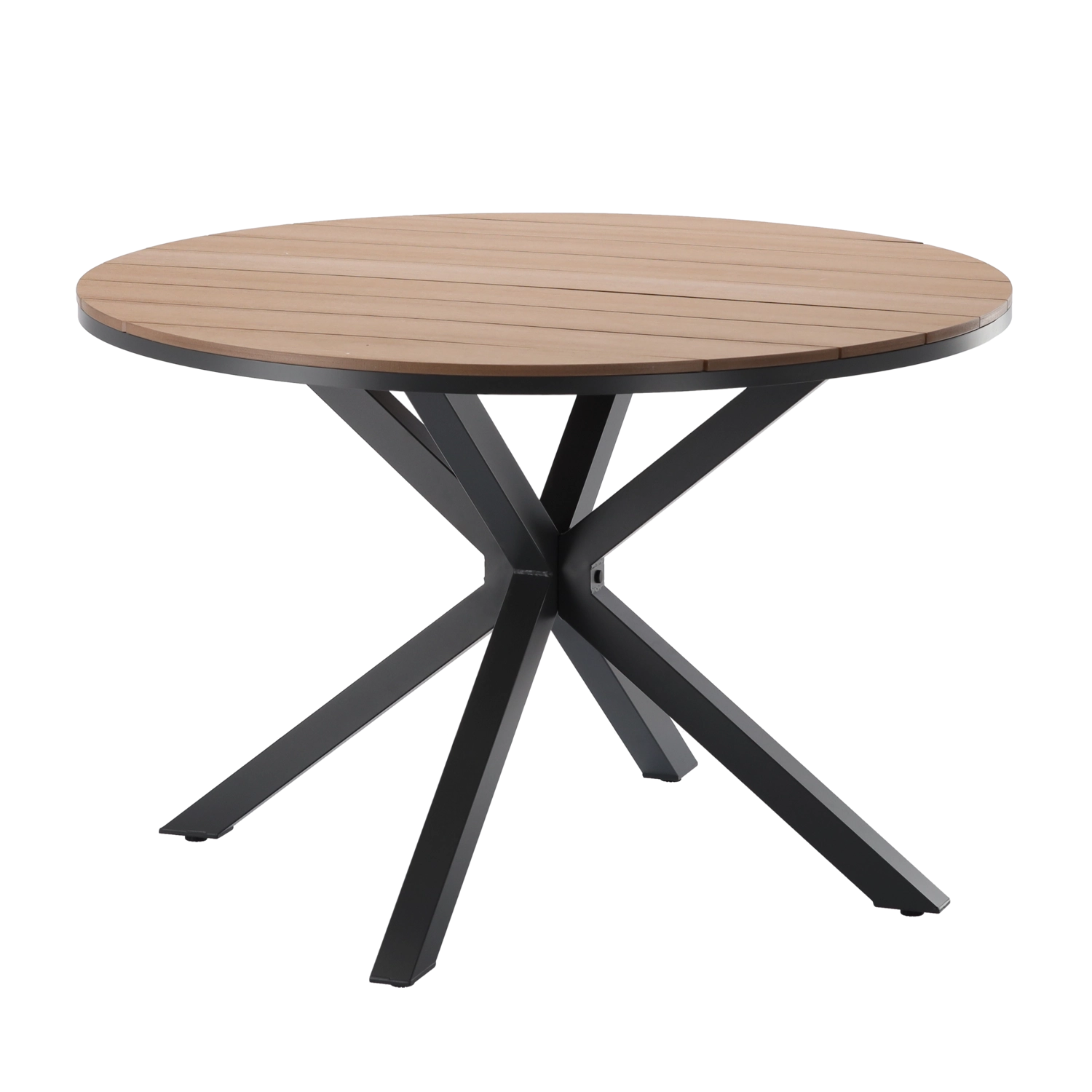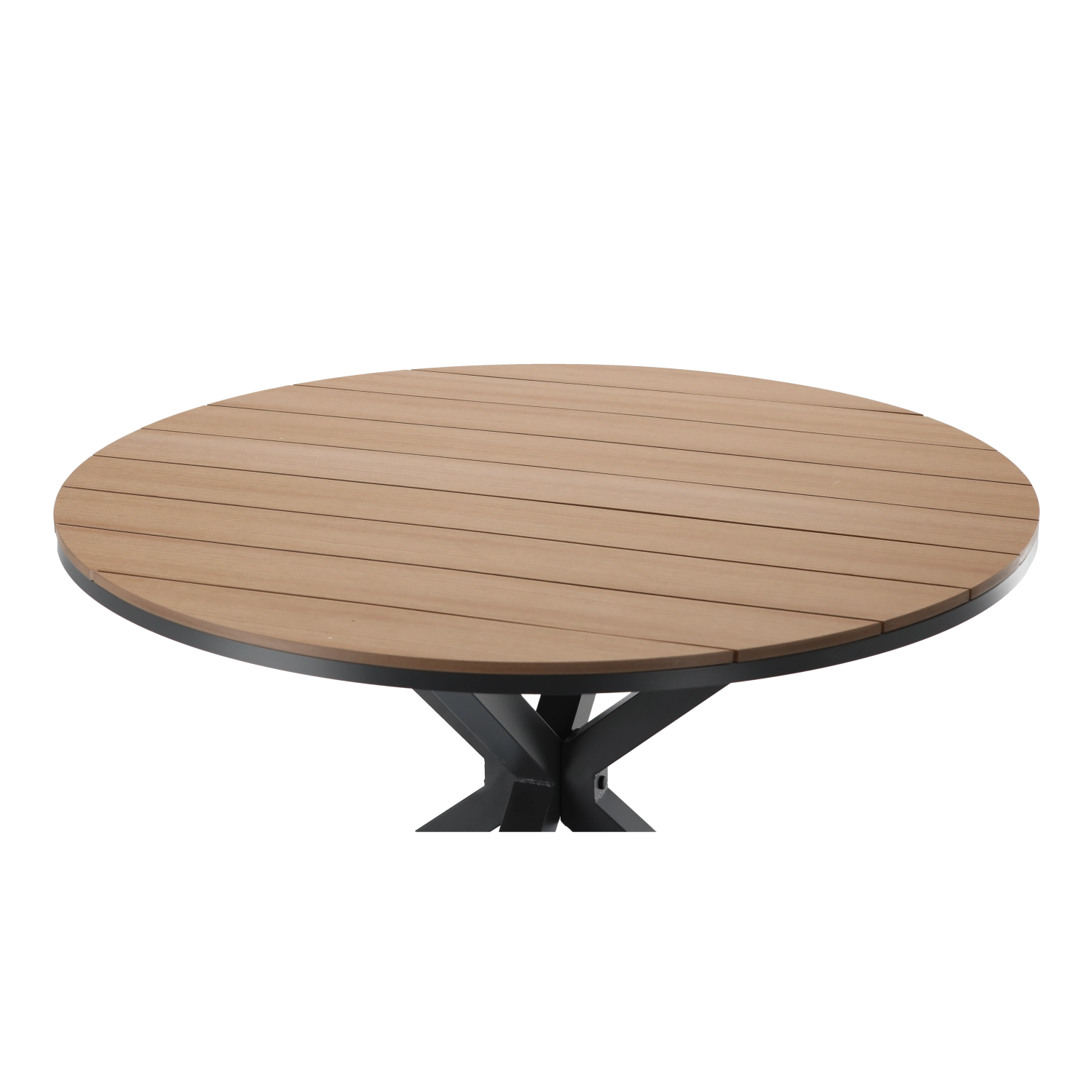 Premer Ø111,5 cm nudi udoben prostor za kavo ali družinsko obedovanje. Stabilno križno podnožje iz profilov 50 × 50 mm in 35 × 20 mm drži mizo trdno na mestu tako na terasi kot pod pergolo. Temno siva barva se odlično ujema z različnimi vrstami vrtnih stolov.