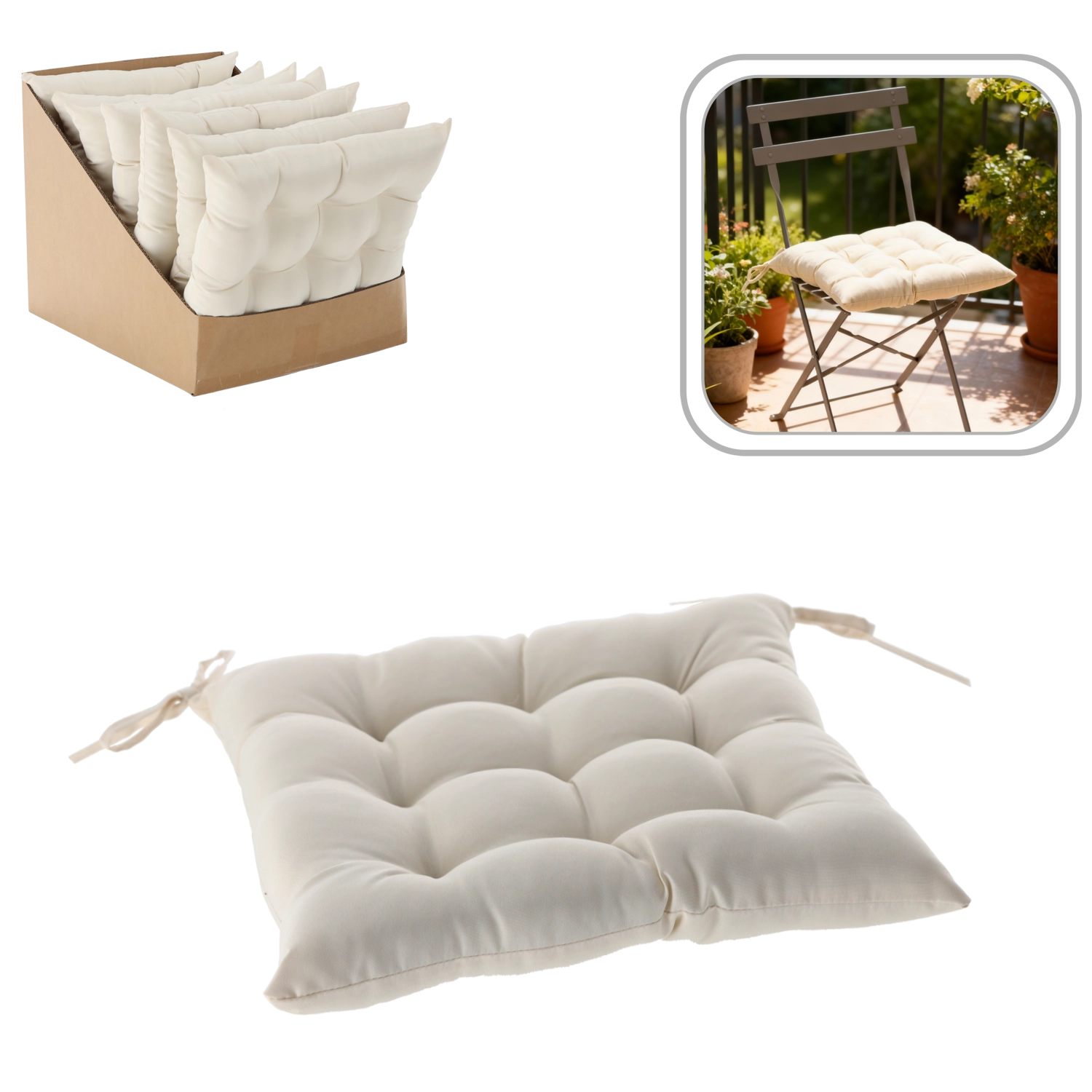 Praktične vrvice za zavezovanje poskrbijo, da sedež ostane trdno na mestu tudi pri vsakdanji uporabi. Vzdržljiva poliestrska prevleka je enostavna za vzdrževanje in primerna za običajno domačo ter zunanjo rabo.