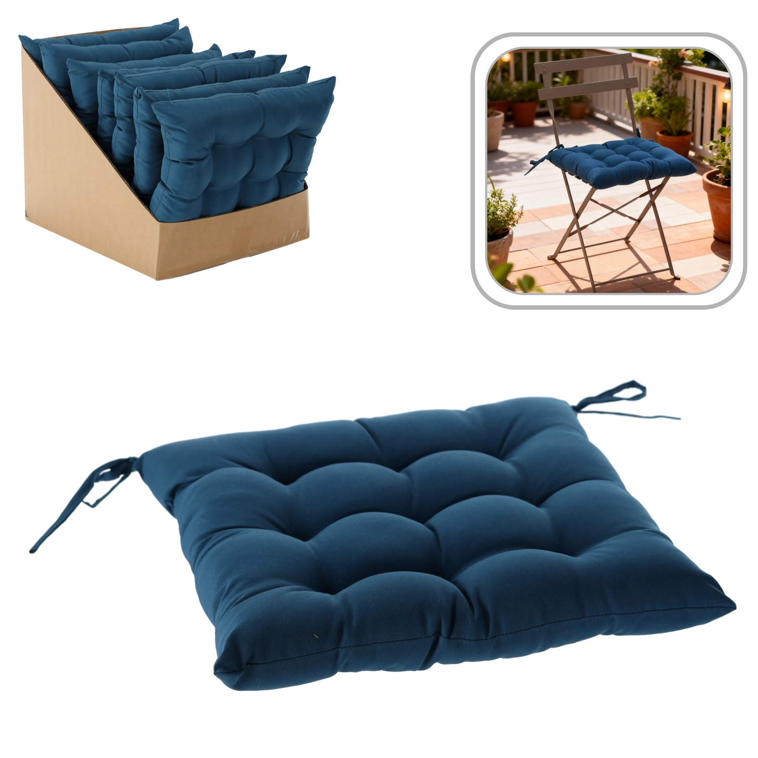 Stilska modra blazina za stol v merah 40 × 40 × 6 cm bo vašemu sedenju dodala večje udobje in svež videz. Zahvaljujoč 9 točkam prešivanja ohranja obliko, je prijetno mehka in jo s vrvicami enostavno pritrdite na stol doma, na balkonu ali terasi.