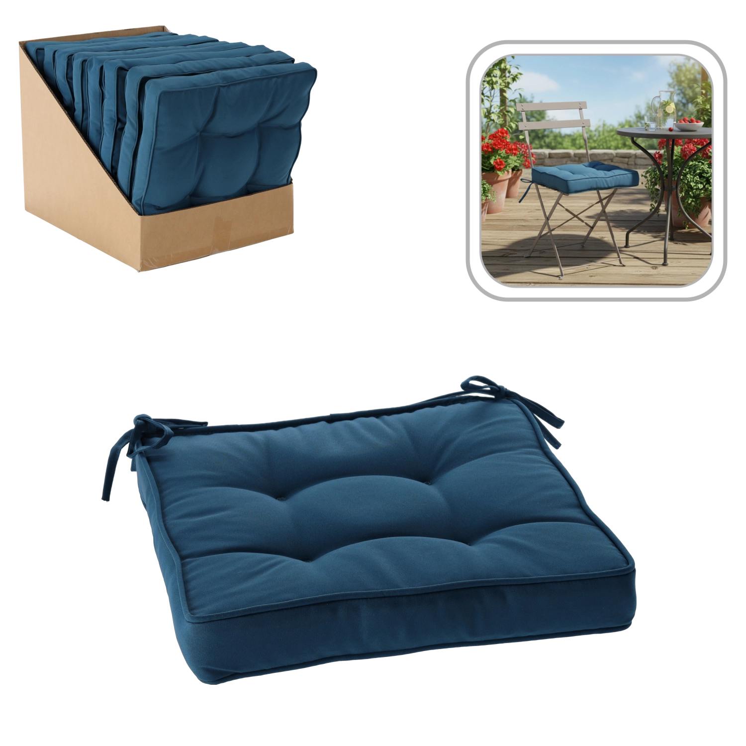 Ta kakovostna blazina v velikosti 40 × 40 × 6 cm je idealna za vsakodnevno sedenje. Gosto polnilo iz poliestrskih vlaken prinaša mehkobo in oporo, medtem ko prešitje (tuftanje) pomaga ohranjati obliko in daje eleganten videz. Odporn prevlek iz 100% poliestra je primeren za enostavno nego in običajno uporabo v gospodinjstvu ter na prostem.