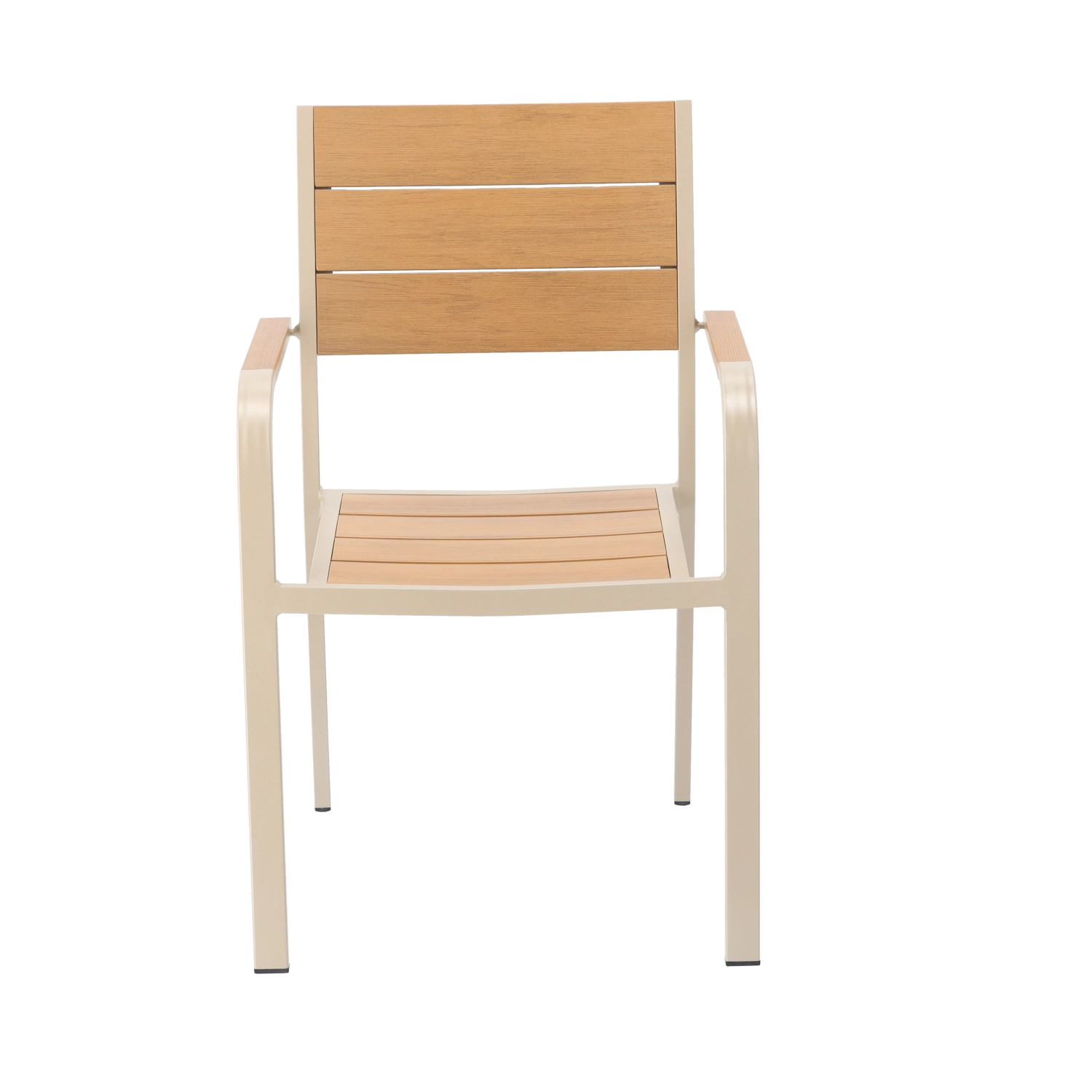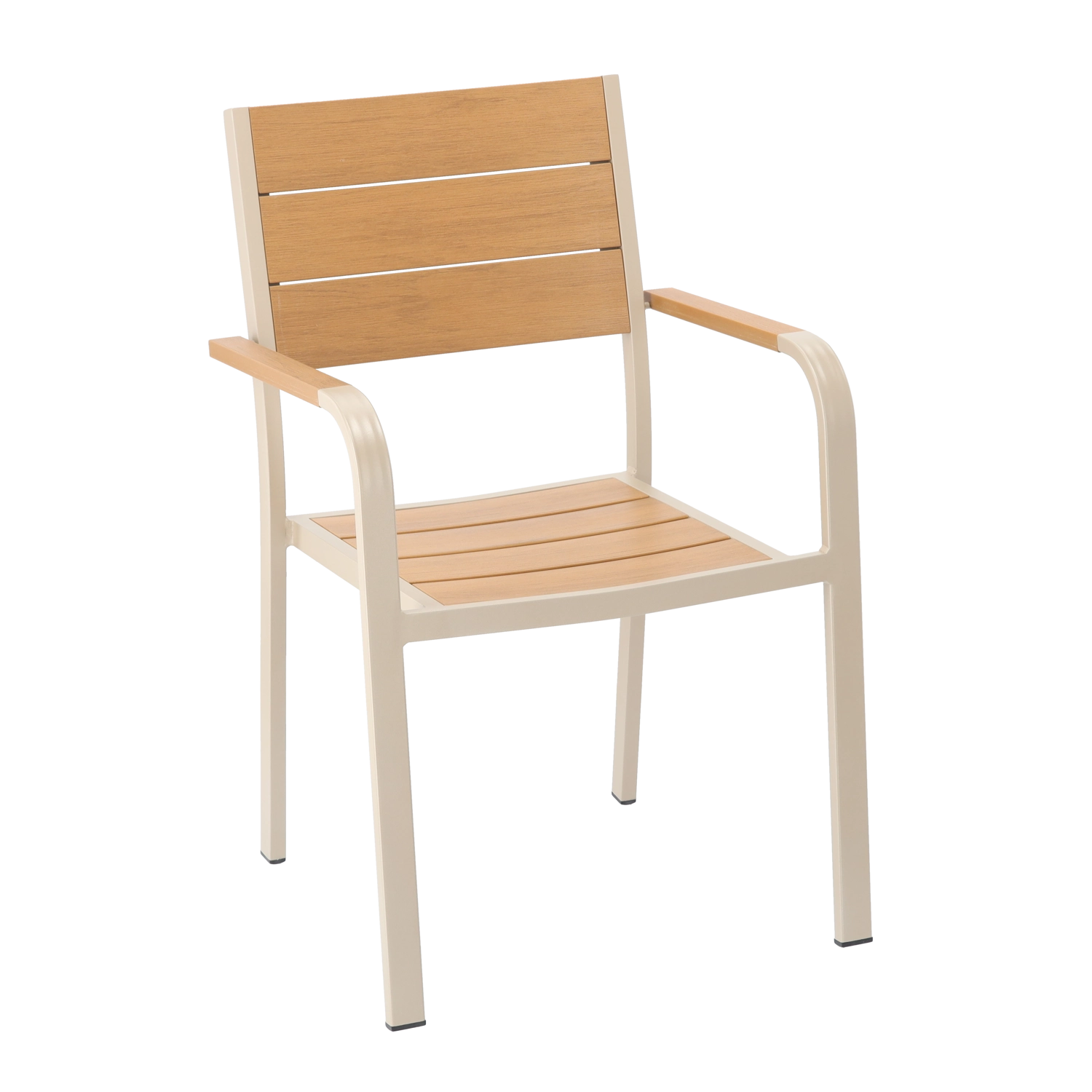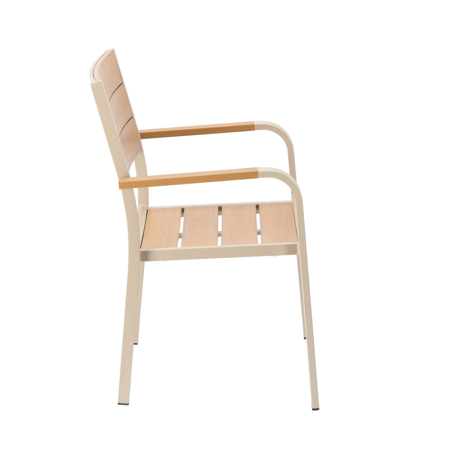 Eleganten bež vrtni stol združuje lahko aluminijasto ogrodje z lamelami v lesnem dekorju za naraven videz brez zahtevnega vzdrževanja. Zahvaljujoč prašnemu lakiranju je odporen na vlago, sonce in vsakodnevno uporabo ter se odlično poda tako k modernim kot klasičnim zunanjim prostorom.