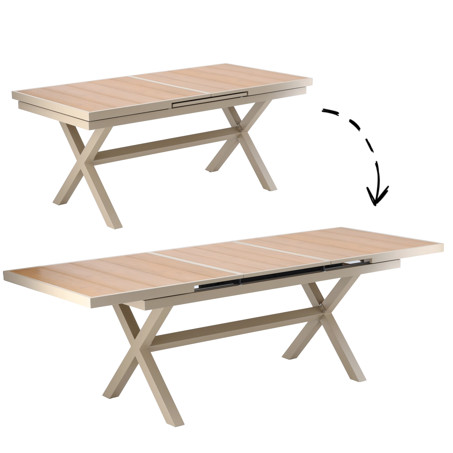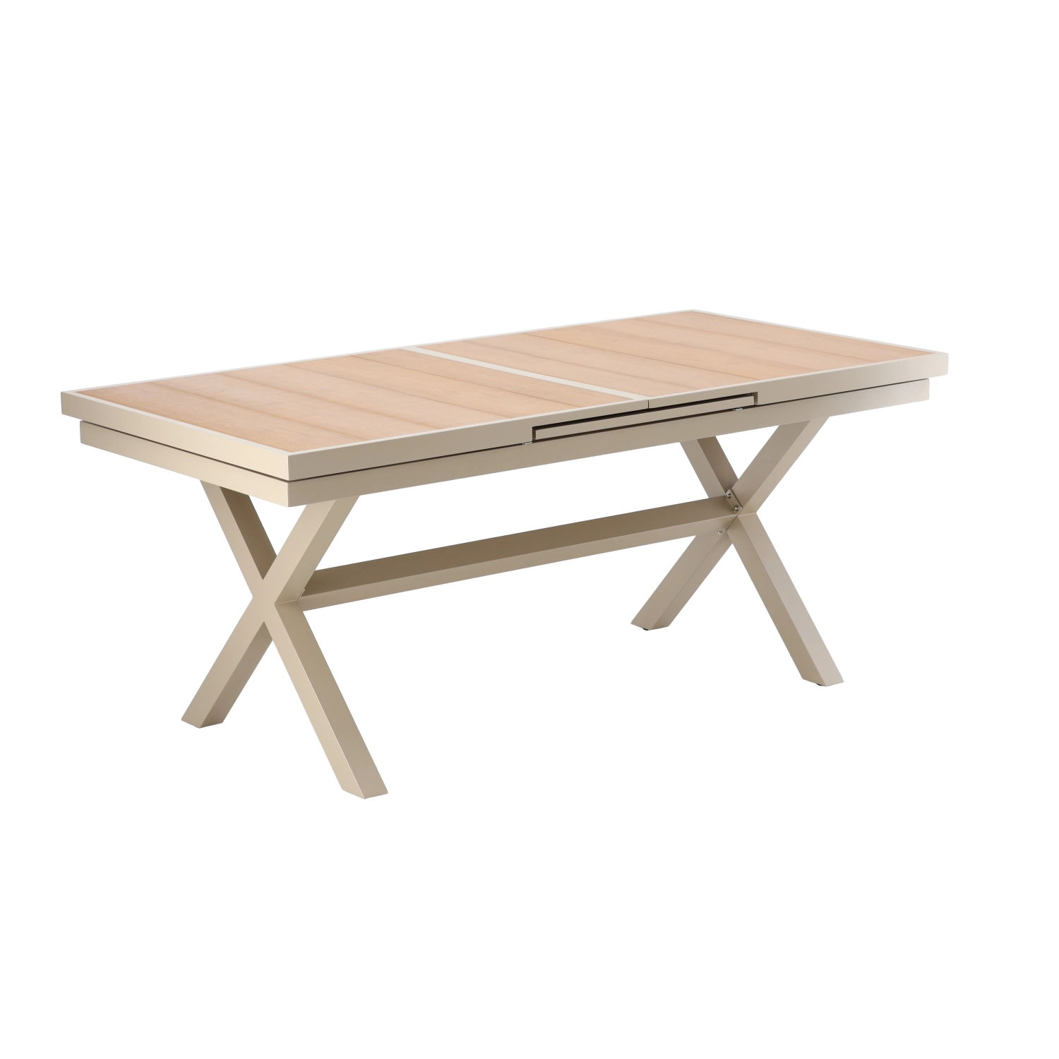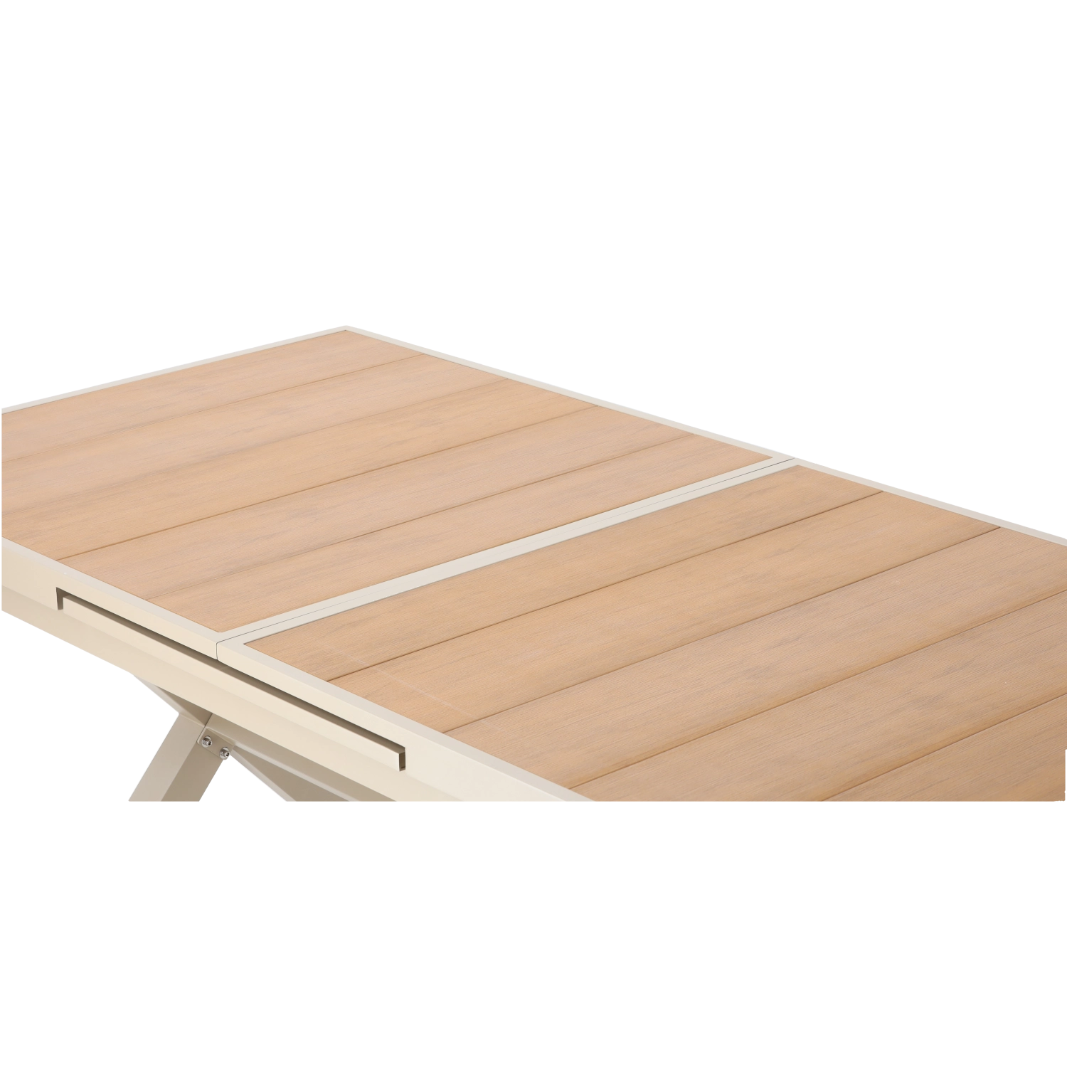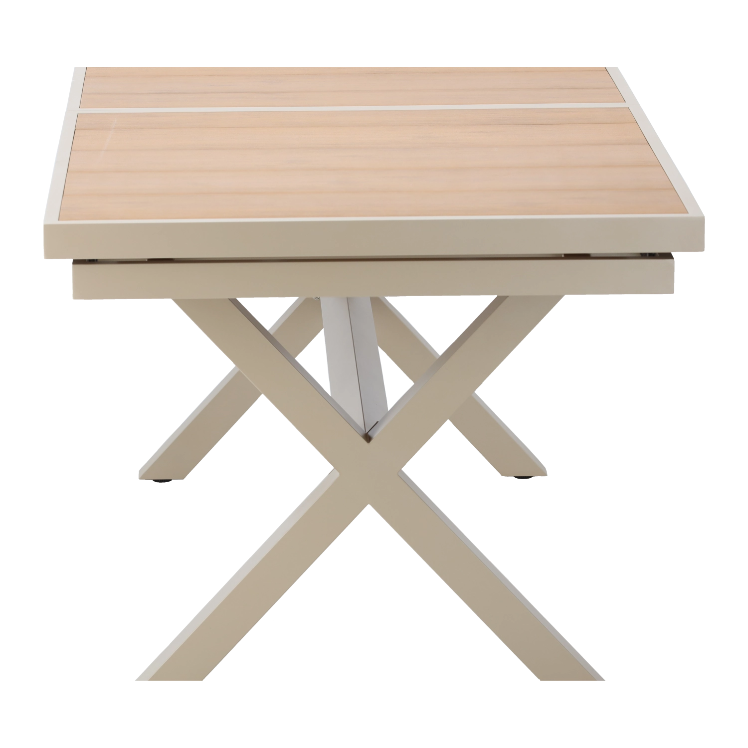 Elegantna raztegljiva vrtna miza v bež barvi združuje moderen dizajn, vzdržljivo aluminijasto konstrukcijo in praktično funkcijo podaljšanja na 240 cm. Plošča z lesenim dekorjem deluje naravno in ne zahteva zahtevnega vzdrževanja, zato je idealna za teraso, vrt in tudi za komercialne prostore.