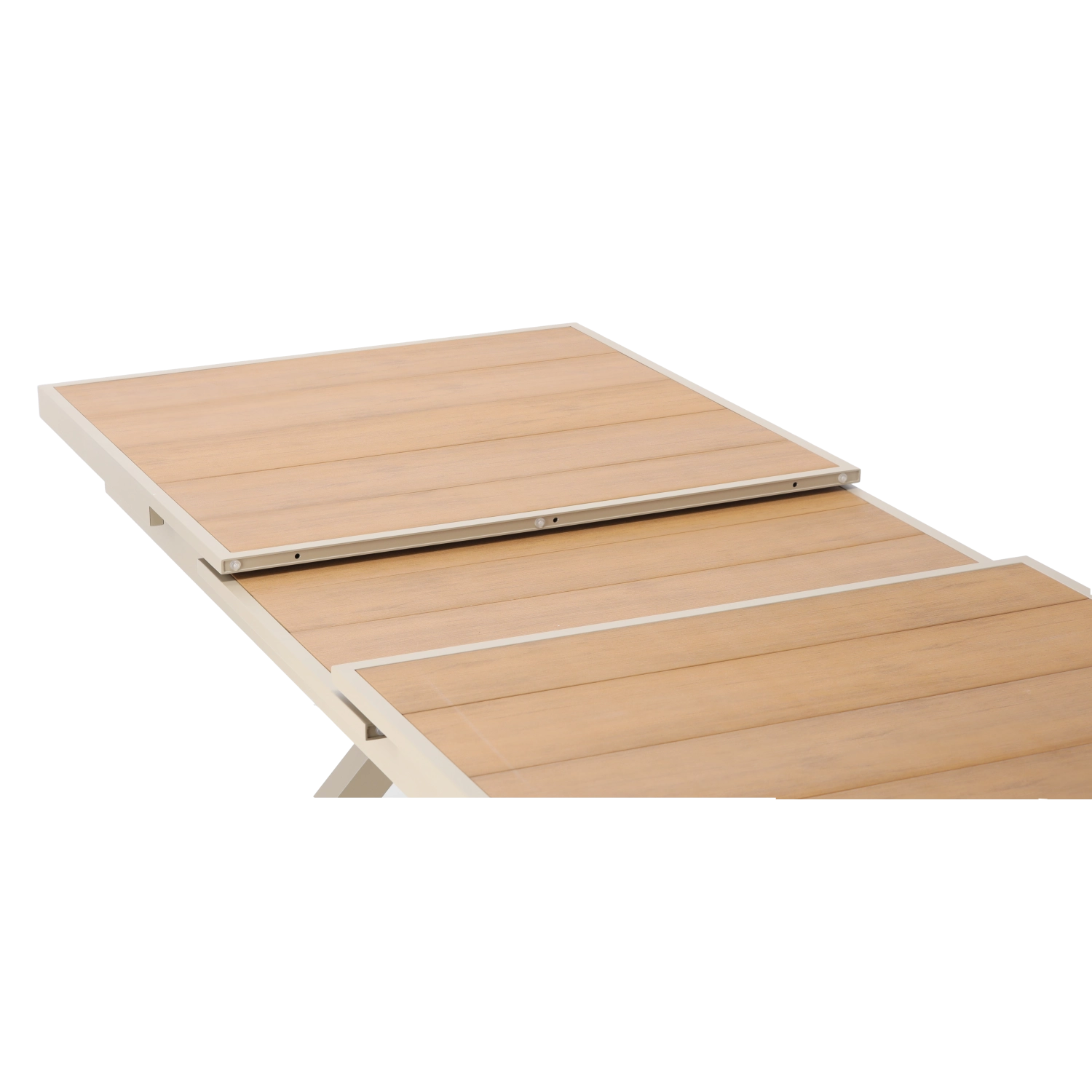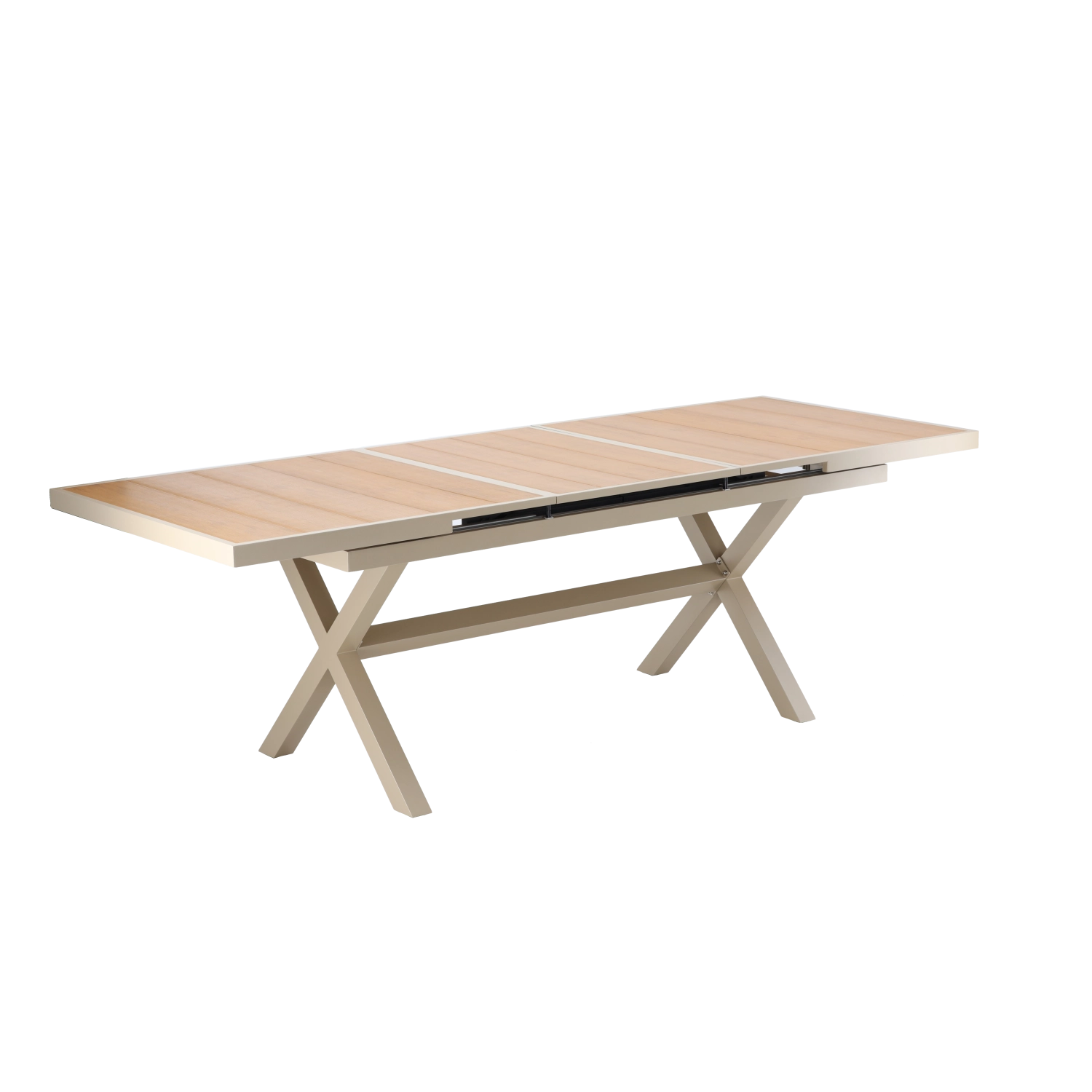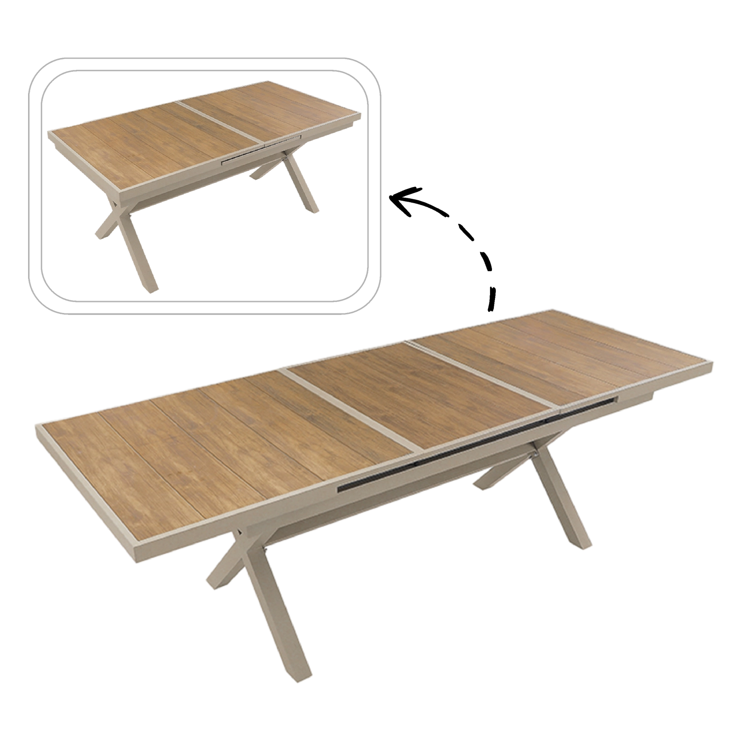 Elegantna raztegljiva vrtna miza v bež barvi združuje moderen dizajn, vzdržljivo aluminijasto konstrukcijo in praktično funkcijo podaljšanja na 240 cm. Plošča z lesenim dekorjem deluje naravno in ne zahteva zahtevnega vzdrževanja, zato je idealna za teraso, vrt in tudi za komercialne prostore.