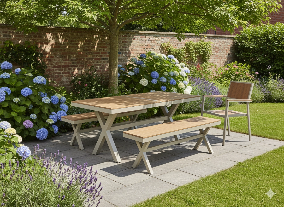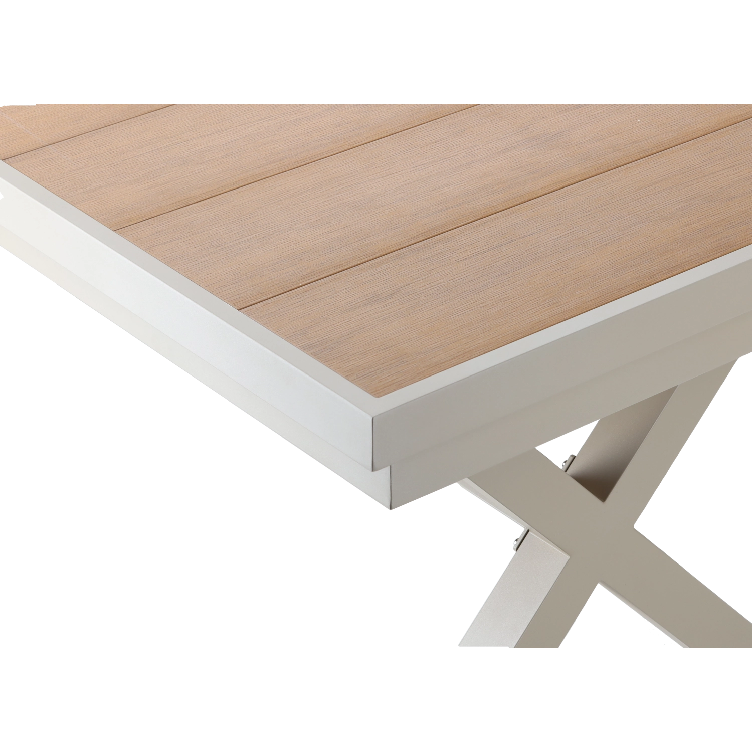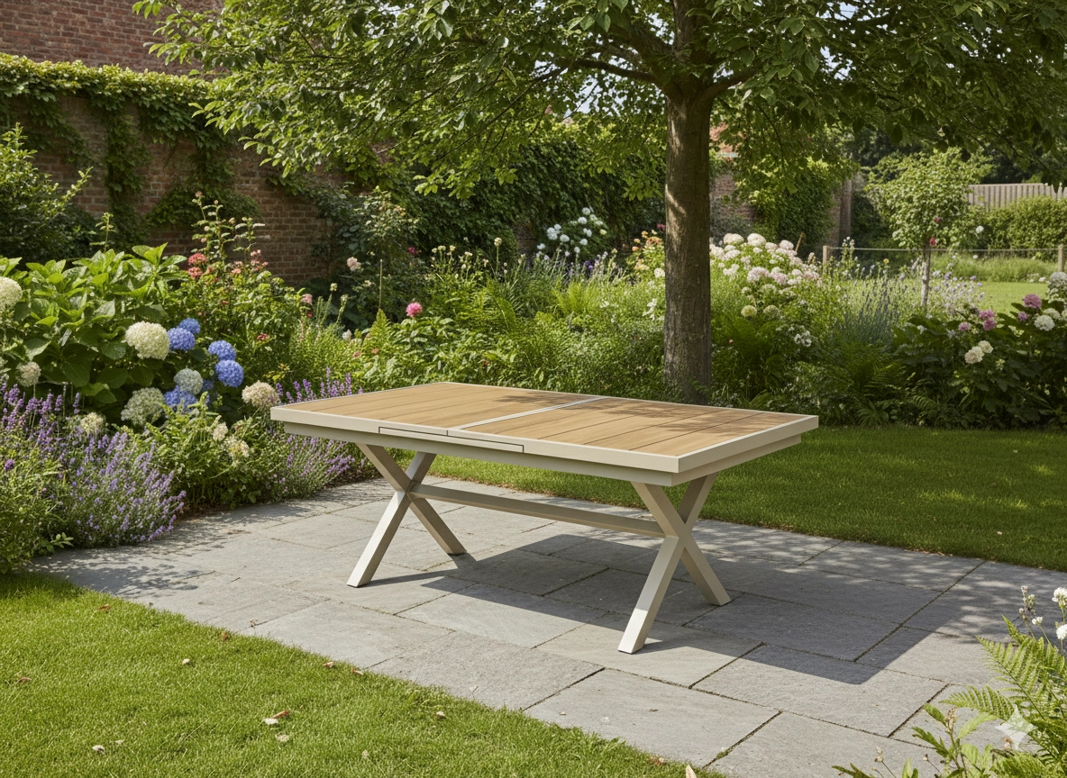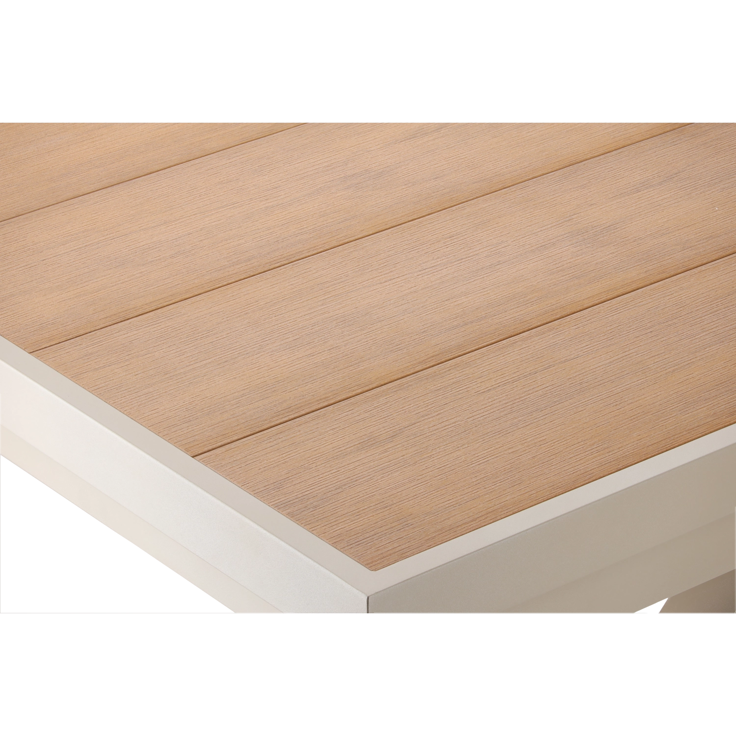 Elegantna raztegljiva vrtna miza v bež barvi združuje moderen dizajn, vzdržljivo aluminijasto konstrukcijo in praktično funkcijo podaljšanja na 240 cm. Plošča z lesenim dekorjem deluje naravno in ne zahteva zahtevnega vzdrževanja, zato je idealna za teraso, vrt in tudi za komercialne prostore.