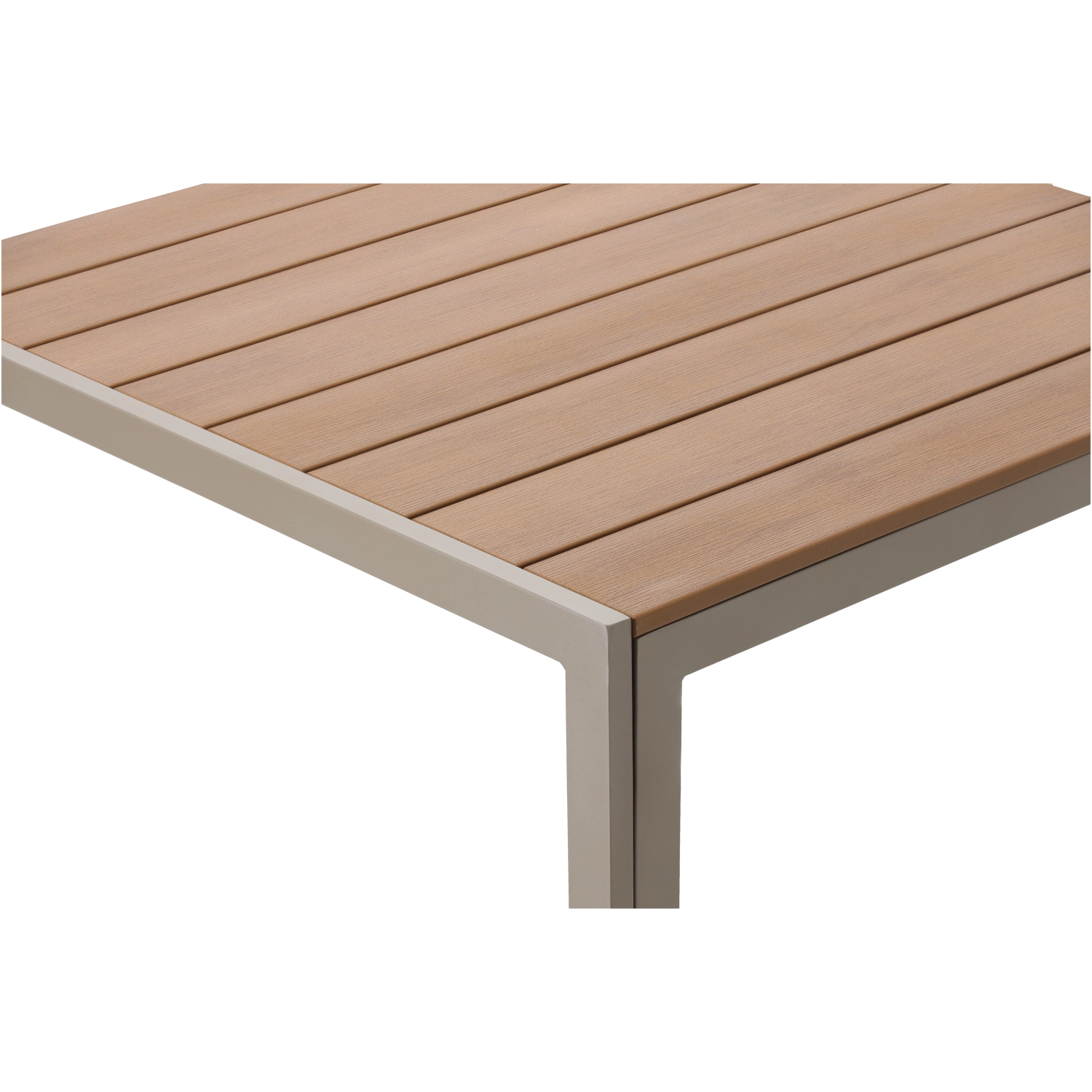 Moderna aluminijasta miza z lesno-plastičnimi lamelami nudi brezčasen videz naravnega lesa brez zahtevnega vzdrževanja. Površina je prašno lakirana, zato odlično kljubuje vlagi, UV-sevanju in koroziji. Nevrtralna bež barva se zlahka kombinira z različnimi slogi pohištva in dodatkov.