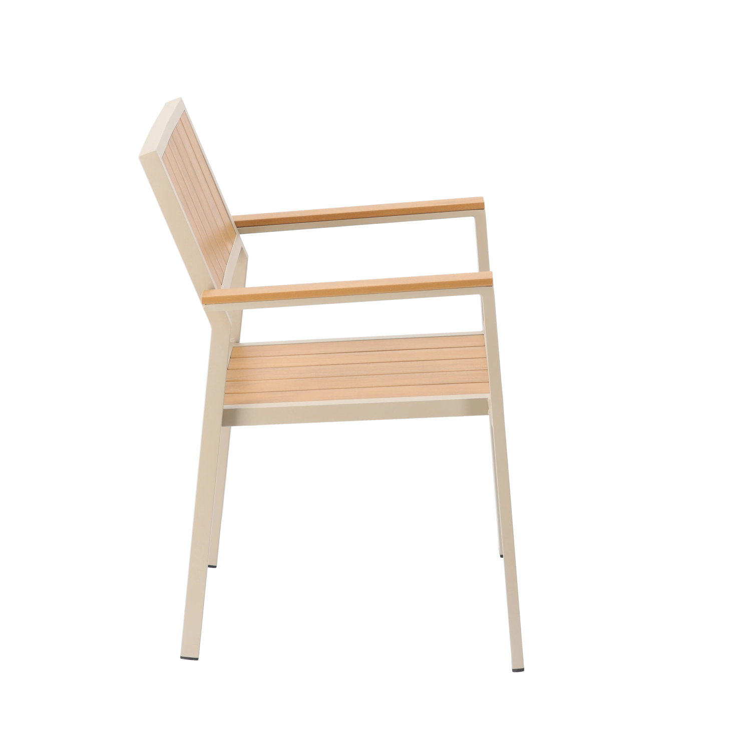 Sodoben vrtni stol iz aluminija v elegantni bež barvi združuje lahko in stabilno konstrukcijo z odpornostjo na vremenske vplive ter udobnim sedenjem. Letvice na sedišču in naslonu v lesnem dekorju brez potrebe po vzdrževanju ter nosilnost do 150 kg so primerni za teraso, balkon in vrt.