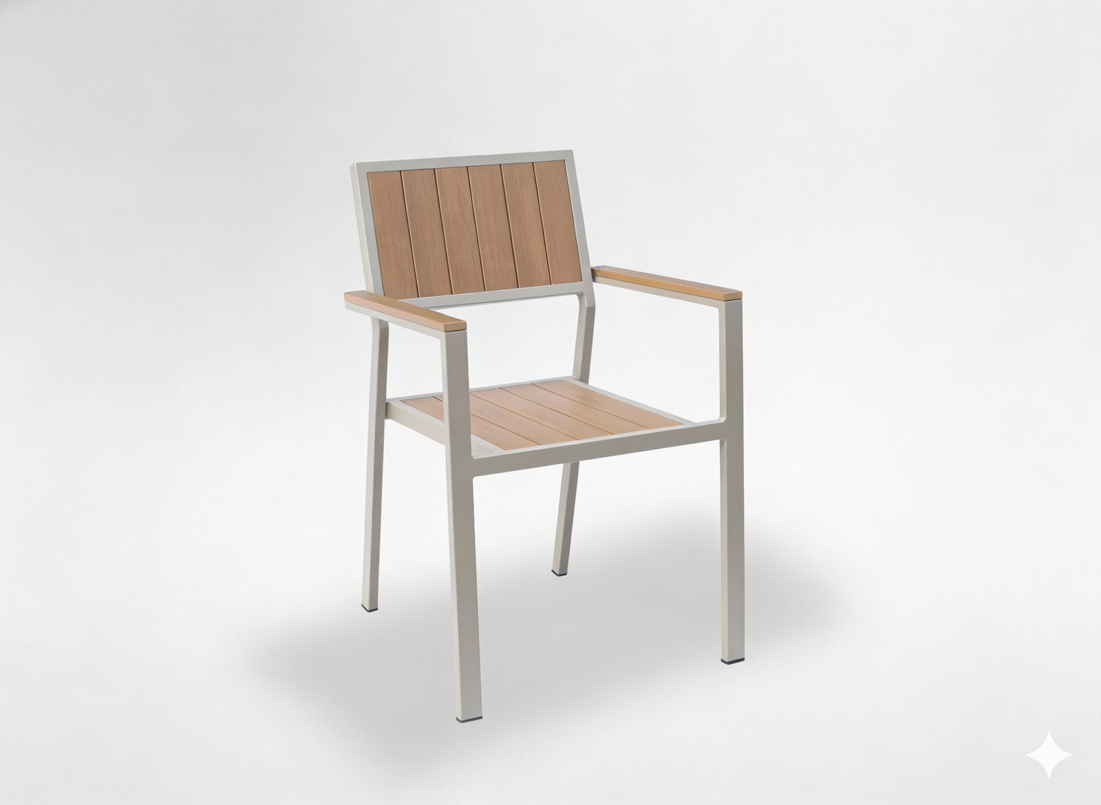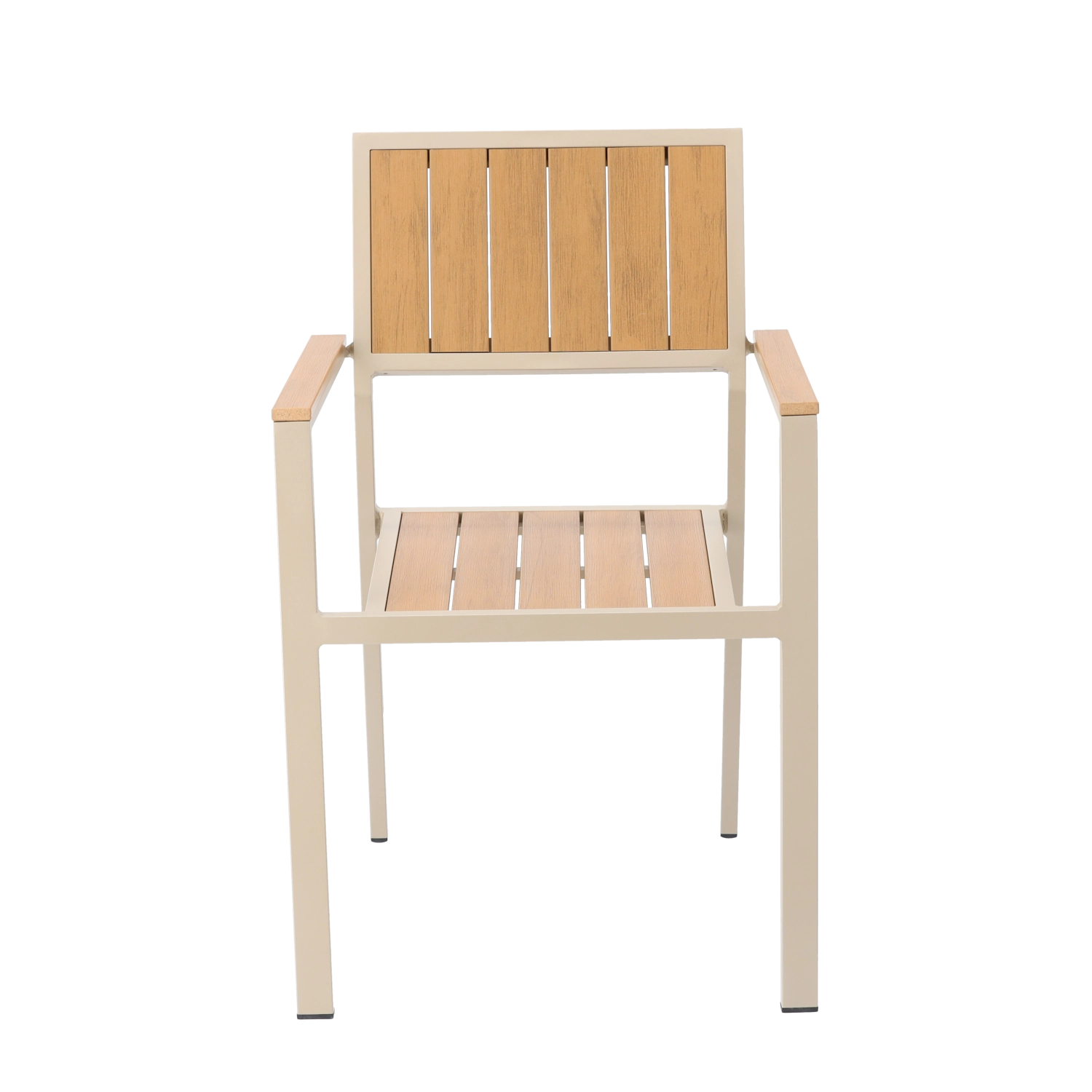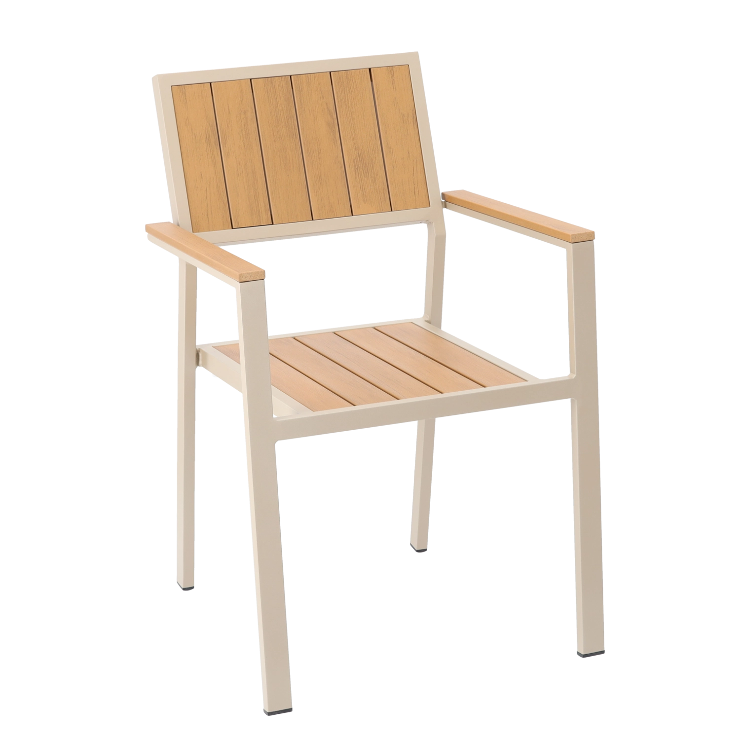 Stilen aluminijast vrtni stol v bež izvedbi je idealna izbira za zunanje sedenje. Prašno lakiran okvir je odporen na vlago in sonce, medtem ko letvice v lesnem dekorju zagotavljajo naraven videz brez potrebe po rednem vzdrževanju. Zaradi premišljene konstrukcije z nasloni za roke stol nudi udobje pri vsakodnevni uporabi.