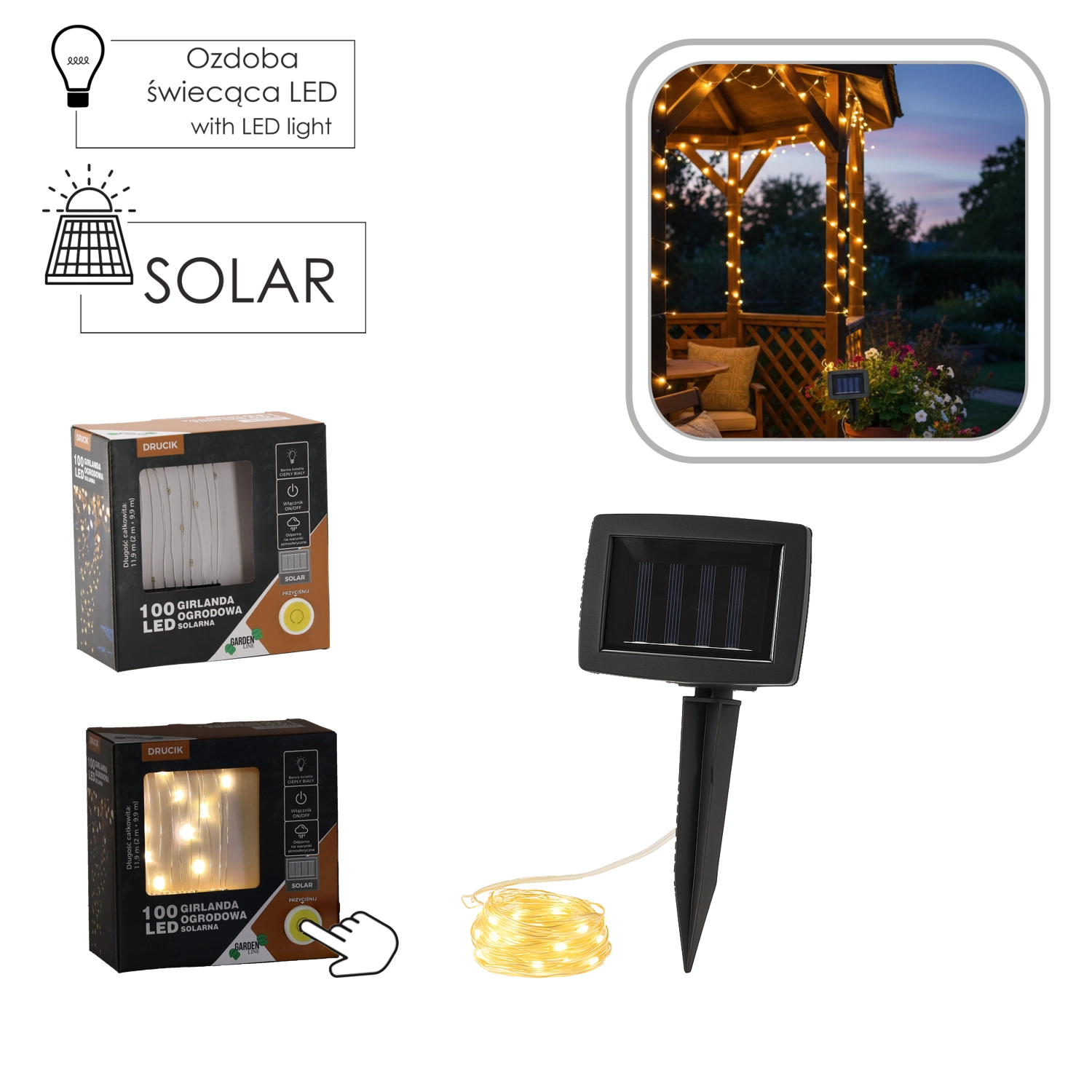 Solarni LED niz prinese v vaše zunanje prostore prijetno vzdušje toplo bele barve. Skupna dolžina svetlobnega dela 9,9 m z razmiki 10 cm omogoča enakomerno in dekorativno osvetlitev ograj, pergol, drevesc in ograjnih držal. Napajanje iz polikristalnega solarnega panela in polnilne baterije Ni‑MH 1,2 V AA 400 mAh zagotavlja brezžično in brezvzdrževalno delovanje.