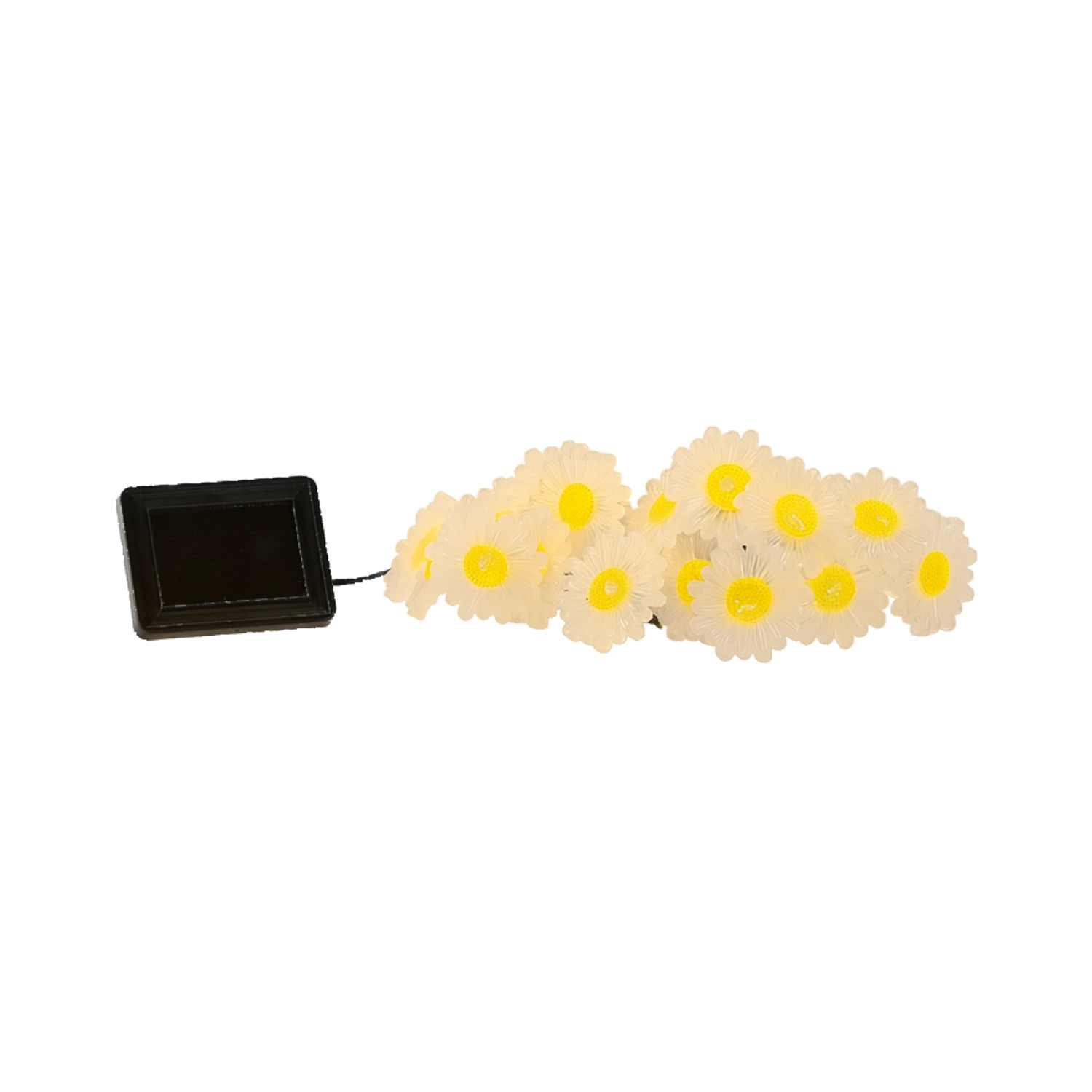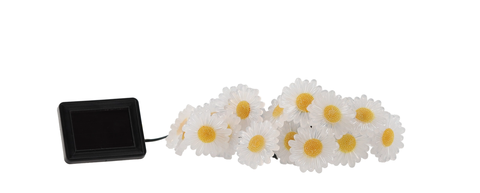 Ustvarite prijetno vzdušje z dekorativno svetlobno girlando v obliki marjetic. Sončno napajanje varčuje z energijo in omogoča brezžično postavitev kjerkoli na vrtu, pergoli ali balkonu. Topla bela svetloba poudari večerni klepet in praznično okrasitev.
