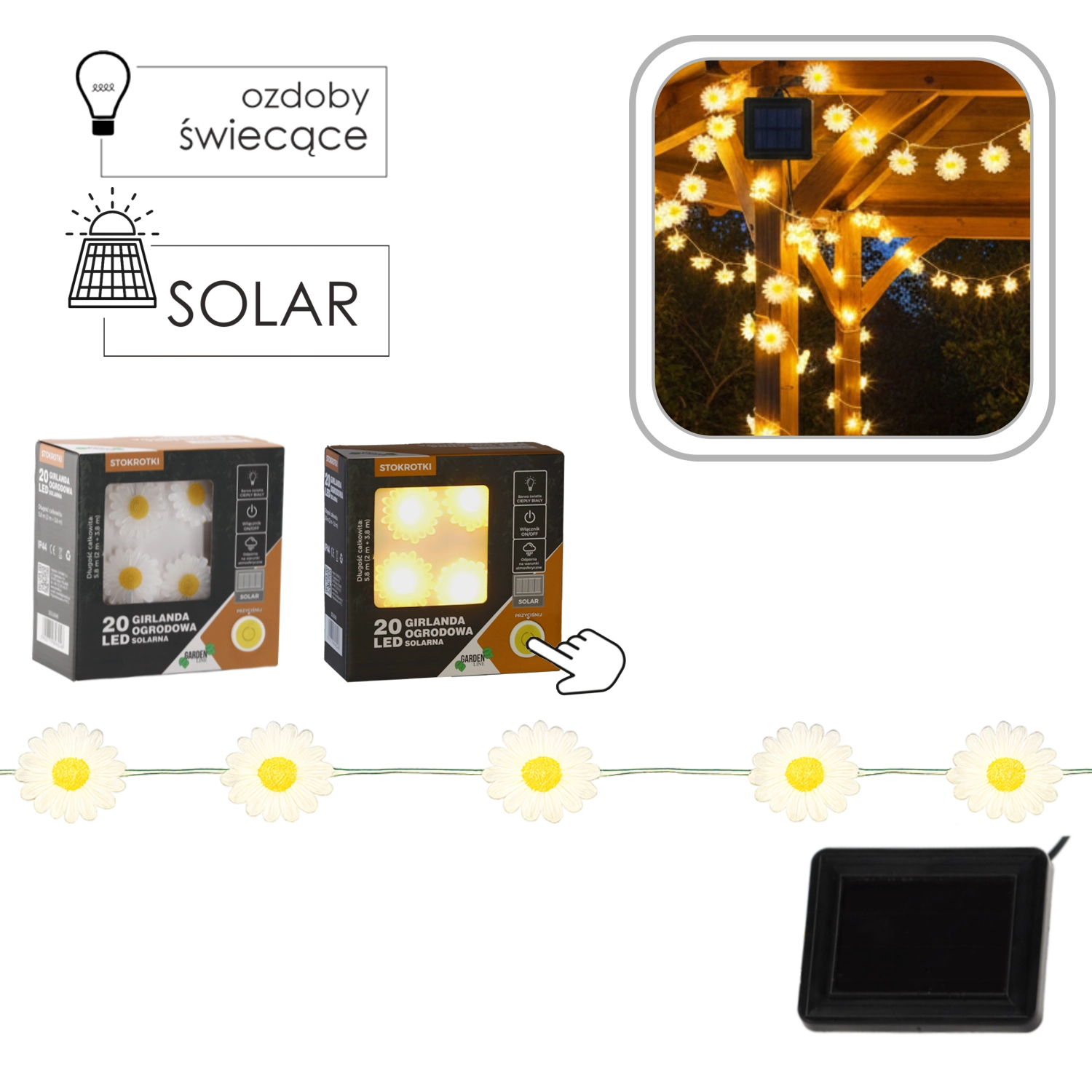 Popestrite teraso, balkon in vrt s sončno girlando z marjeticami. Ponuja 20 LED v odtenku toplo bela, dve dolžini kabla 2 + 3,8 m, izbiro načina neprekinjena svetloba ali utripanje ter zaščito IP44 za zunanjo uporabo. Napajanje zagotavlja polikristalni sončni panel in polnilna baterija za do 6–7 ur svetlobe.